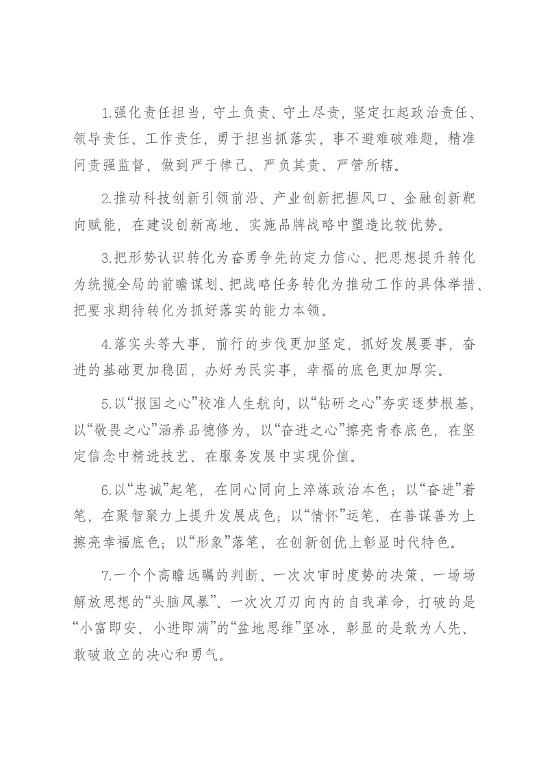 3.把形势认识转化为奋勇争先的定力信心、把思想提升转化为统揽全局的前瞻谋划、把战略任务转化为推动工作的具体举措、把要求期待转化为抓好落实的能力本领。