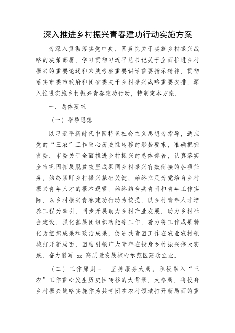 深入推进乡村振兴青春建功行动实施方案为深入贯彻落实党中央、国务院关于实施乡村振兴战略的决策部署,学习贯彻习近平总书记关于全面推进乡村振兴的重要论述和来陕考察重要讲话重要指示精神,贯彻落实市委市政府和团省委关于乡村振兴战略重要安排,深入推进实施乡村振兴青春建功行动,特制定本方案。一、总体要求(一)指导思想以习近平新时代中国特色社会主义思想为指导,适应党的“三农”工作重心历史性转移的形势要求,准确把握省委、市委关于全面推进乡村振兴的总体部署,认真落实全市巩固拓展脱贫攻坚成果同乡村振兴有效衔接的各项任务,始终紧盯乡村振兴基础关键,始终立足为党培育乡村振兴青年人才的根本逻辑,始终结合共青团和青年工作实际,以乡村振兴青春建功行动为统揽,以乡村青年人才培养工程为牵引,同步开展助力乡村产业发展、助力乡村社会建设、强化基层团组织功能等工作,着力将工作成果转化为组织成果和政治成果,促进共青团工作在农业农村领域打开新局面,团结引领广大青年在投身乡村振兴伟大实践、奋力谱写燃高质量发展核心示范区建功立业。(二)工作原则--坚持服务大局。积极融入“三农”工作重心发生历史性转移的大背景、大格局,将投身乡村振兴战略实施作为共青团在农村领域打开新局面的重大机遇,带动农村共青团工作和建设不断恢复功能。坚持小切口、大纵深,在党政工作大局下思考共青团应为能为的工作领域,充分发挥团的基层组织作用,精准谋划实施重点项目。--坚持育人为本。注重为党培养农村青年人才,着力打造符合时代要求、青年需求的工作矩阵,引导广大农村青年增强责任感和使命感,争当新时代乡村振兴的生力军。始终坚持发挥广大农村青年的积极性、主动性和创造性,充分尊重和维护农村青年的正当权益。--坚持基层导向。充分考虑各县(市、区)差异,鼓励和支持各县(市、区)从实际出发,积极实施特色项目。着眼于深化共青团改革,牢固树立“大抓基层”导向,注重整合项目和资源向基层倾斜,推动基层组织网络覆盖更加全面、基础工作更加扎实、组织生活更有活力。特别关注乡村振兴重点帮扶县和已脱贫摘帽县,倾斜资源、重点支持,巩固拓展脱贫攻坚成果。(三)目标任务到2025年,全共团服务乡村振兴战略的工作框架全面确立、重点更加突出、机制更加完善、功能更加凸显,团的基层组织得到全面强化,形成一批富有实效、党政认可、青年和社会评价好的品牌工作,培养一批乡村振兴青年领路人、产业致富青年带头人、乡村文化青年传承人(以下简称“三类人”)。