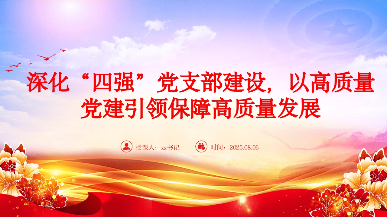 深化“四强”党支部建设,以高质量党建引领保障高质量发展时间:2025.08.06前言PREFACE党的力量源于组织,组织强则事业兴。习近平总书记强调“要建设政治功能强、支部班子强、党员队伍强、作用发挥强的党支部”,为新时代基层党建工作指明了方向。市直机关各级党组织要深入贯彻习近平总书记重要指示精神,以“四强”党支部建设为抓手,推动基层党组织全面进步、全面过硬,为高质量发展提供坚强组织保证。