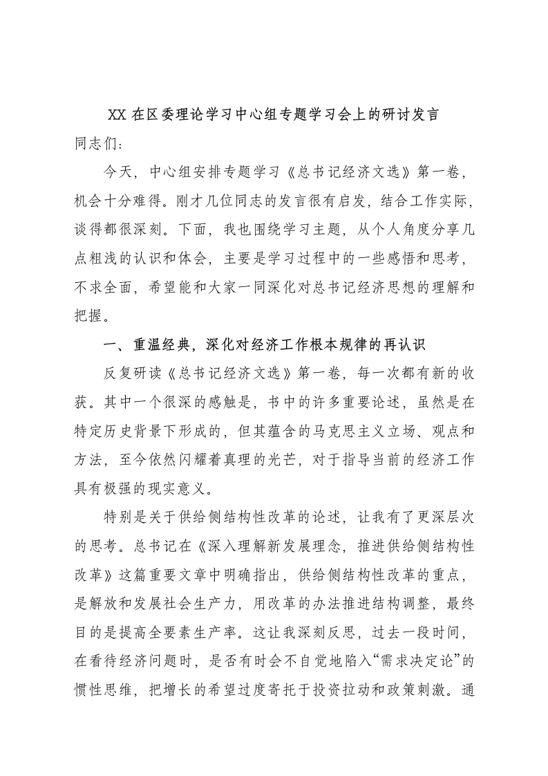 X在区委理论学习中心组专题学习会上的研讨发言同志们今天,中心组安排专题学习《总书记经济文选》第一卷,机会十分难得。刚才几位同志的发言很有启发,结合工作实际,谈得都很深刻。下面,我也围绕学习主题,从个人角度分享几点粗浅的认识和体会,主要是学习过程中的一些感悟和思考,不求全面,希望能和大家一同深化对总书记经济思想的理解和把握。一、重温经典,深化对经济工作根本规律的再认识反复研读《总书记经济文选》第一卷,每一次都有新的收获。其中一个很深的感触是,书中的许多重要论述,虽然是在特定历史背景下形成的,但其蕴含的马克思主义立场、观点和方法,至今依然闪耀着真理的光芒,对于指导当前的经济工作具有极强的现实意义。特别是关于供给侧结构性改革的论述,让我有了更深层次的思考。总书记在《深入理解新发展理念,推进供给侧结构性改革》这篇重要文章中明确指出,供给侧结构性改革的重点,是解放和发展社会生产力,用改革的办法推进结构调整,最终目的是提高全要素生产率。这让我深刻反思,过去一段时间,在看待经济问题时,是否有时会不自觉地陷入“需求决定论”的惯性思维,把增长的希望过度寄托于投资拉动和政策刺激。通过这次学习,我更加清醒地认识到,供给和需求是市场经济内在关系的两个基本方面,二者互为条件、相互转化,形成动态的平衡。强调供给侧,绝不是否定需求侧,而是要在更高水平上实现供需的良性循环。联系到我区的发展实际,这一点尤为重要。作为一个中心城区,我们的资源禀承、空间限制决定了无法走粗放式扩张的老路。我们的优势在于供给侧,在于能否提供更高品质、更具创新性、更能满足人民群众对美好生活向往的产品与服务。反思当前,我们的供给结构是否完全适应了需求结构的变化?比如,在高端商务服务领域,我们是否培育出了具有核心竞争力的本土品牌?在数字经济和实体经济融合方面,我们是否打造出了能够引领行业变革的新业态、新模式?这些问题,正是《总书记经济文选》第一卷引导我去深入思考的时代课题。它提醒我,必须时刻保持清醒,把工作的着力点真正放到优化供给结构、提升供给质量上来,这才是推动高质量发展的治本之策。二、探寻路径,领悟创新驱动高质量发展的核心要义《总书记经济文选》第一卷将“坚持创新驱动,建设现代化经济体系”置于突出位置深刻阐明了创新在经济发展全局中的核心地位。总书记强调,“着力实施创新驱动发展战略,推动新技术、新产业、新业态蓬勃发展”这为我们这样一个创新资源相对富集、转型发展需求迫切的城区指明了前进方向。