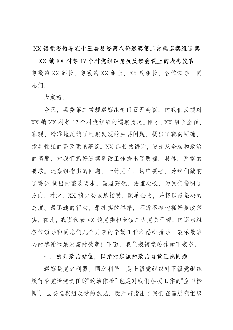 XX镇党委领导在十三届县委第八轮巡察第二常规巡察组巡察X镇X村等17个村党组织情况反馈会议上的表态发言尊敬的X部长,尊敬的X组长、XX副组长,各位领导,同志们:大家好。今天,县委第二常规巡察组专门召开会议,向我们反馈对XX镇X村等17个村党组织的巡察情况。刚才,X组长全面、客观、精准地反馈了巡察发现的主要问题,提出了靶向明确、指导性强的整改意见建议。X部长的讲话,更是从全局和政治的高度,对我们抓好巡察整改工作提出了明确、具体、严格的要求。巡察组指出的问题,一针见血、切中要害,为我们敲响了警钟;提出的整改要求,高屋建瓴、语重心长,为我们指明了方向。对此,X镇党委诚恳接受、照单全收,并将以最坚决的态度、最迅速的行动、最扎实的举措,不折不扣地抓好整改落实。在此,我谨代表X镇党委和全镇广大党员干部,向巡察组各位领导和同志们几个月来的辛勤工作和悉心指导,表示最衷心的感谢和最崇高的敬意!下面,我代表镇党委作如下表态:一、提升政治站位,以绝对忠诚的政治自觉正视问题巡察是党之利器、国之利器,是上级党组织对下级党组织履行管党治党责任的“政治体检”,也是对我们各项工作的“全面检阅”。县委巡察组反馈的意见,既严肃指出了我们在基层党组织建设、干部队伍管理、乡村振兴战略实施、财经纪律执行等方面存在的突出问题和短板弱项,也饱含着县委对X镇发展的殷切期望和对我们干部的关心爱护。这些问题,表现在基层,根子在镇党委的统筹指导和监督落实上。我们必须清醒地认识到,巡察发现的问题,绝非孤立的、个别的业务瑕疵,而是对我们政治站位、政治担当、政治能力的直接考验。镇党委将立即召开专题会议,组织全镇中层以上干部、各村党组织书记,原原本本、逐字逐句地学习领会X组长的反馈意见和X部长的讲话精神。引导全镇上下深刻认识到,抓好巡察整改,是坚定拥护“两个确立”、坚决做到“两个维护”的具体行动,是检验我们“四个意识”强不强、党性观念牢不牢的试金石。我们绝不能有任何“过关”思想,更不能有任何抵触情绪。必须将此次整改工作作为当前和今后一个时期最重要的政治任务,摆在压倒一切的位置,以“不贰过”的决心和闻过则喜、知过不讳的胸襟,主动认领问题、深刻剖析根源,切实把思想和行动统一到县委和巡察组的部署要求上来,将压力层层传导下去,将责任节节压实到位,确保全镇上下形成“整改不落实,就是对党不忠诚”的高度共识,以刮骨疗毒的勇气和自我革命的精神,坚决彻底地完成好这项严肃的政治任务。二、强化责任担当,以坚如磐石的政治定力狠抓整改整改不力,根源在于责任虚化。巡察反馈意见指出的每一个问题,