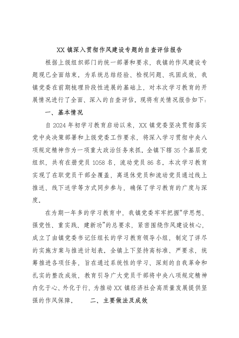 X镇深入贯彻作风建设专题的自查评估报告根据上级组织部门的统一部署和要求,我镇的作风建设专题现已全面结束。为系统总结经验、检视问题、巩固成效,我镇党委在前期梳理阶段性进展的基础上,对本次学习教育的开展情况进行了全面、深入的自查评估。现将有关情况报告如下:一、基本情况自2024年初学习教育启动以来,X镇党委坚决贯彻落实党中央决策部署和上级党委工作要求,将深入学习贯彻中央八项规定精神作为一项重大政治任务来抓。全镇下辖35个基层党组织,共有在册党员1058名,流动党员86名。本次学习教育实现了在职党员干部全覆盖,离退休党员和流动党员通过线上推送、线下送学等方式同步参与,确保了学习教育的广度与深度。在为期一年多的学习教育中,我镇党委牢牢把握“学思想、强党性、重实践、建新功”的总要求,紧密围绕作风建设核心,成立了由镇党委书记任组长的学习教育领导小组,制定了详尽的实施方案与推进计划表。全镇上下坚持高标准、严要求,统筹推进各项任务,旨在通过系统性的学习、深刻的自我革命和扎实的整改成效,教育引导广大党员干部将中央八项规定精神内化于心、外化于行,为推动X镇经济社会高质量发展提供坚强的作风保障。二、主要做法及成效(一)强化组织领导,高位推动学习教育学习教育伊始,镇党委便深刻认识到,有力的组织领导是确保学习教育不虚、不空、不偏的关键。一是健全领导机制,压实主体责任。镇党委第一时间成立了学习教育领导小组及办公室,由党委书记亲自挂帅、靠前指挥,先后主持召开8次专题会议,研究部署、协调推进关键环节工作。班子成员严格落实“一岗双责”,带头深入分管领域和联系点,督导检查学习教育开展情况,形成了“一把手负总责、分管领导具体抓、班子成员协同抓、一级抓一级、层层抓落实”的责任体系,确保压力传导到位。二是精心谋划部署,确保路径清晰。镇党委结合自身实际,制定印发了《XX镇关于深入贯彻作风建设专题的实施方案》,将学习教育细化为动员部署、学习研讨、查摆整治、总结提升四个阶段,并制定了包含52项具体任务的时间表和路线图。在2024年2月的全镇动员部署大会上,党委书记作了深入动员,明确了目标要求,统一了全镇上下的思想和行动。这种体系化的设计,有效避免了学习教育的随意性和盲目性,确保了各项工作有章可循、稳步推进。(二)深化学习研讨,筑牢思想防线镇党委坚持将理论武装贯穿始终,通过多形式、分层次、全覆盖的学习,引导党员干部从思想深处筑牢抵制歪风邪气的