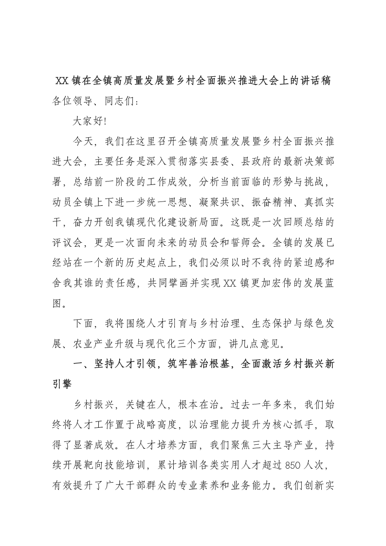 XX镇在全镇高质量发展暨乡村全面振兴推进大会上的讲话稿各位领导、同志们:大家好!今天,我们在这里召开全镇高质量发展暨乡村全面振兴推进大会,主要任务是深入贯彻落实县委、县政府的最新决策部署,总结前一阶段的工作成效,分析当前面临的形势与挑战,动员全镇上下进一步统一思想、凝聚共识、振奋精神、真抓实干,奋力开创我镇现代化建设新局面。这既是一次回顾总结的评议会,更是一次面向未来的动员会和誓师会。全镇的发展已经站在一个新的历史起点上,我们必须以时不我待的紧迫感和舍我其谁的责任感,共同擘画并实现X镇更加宏伟的发展蓝图。下面,我将围绕人才引育与乡村治理、生态保护与绿色发展、农业产业升级与现代化三个方面,讲几点意见。一、坚持人才引领,筑牢善治根基,全面激活乡村振兴新引擎乡村振兴,关键在人,根本在治。过去一年多来,我们始终将人才工作置于战略高度,以治理能力提升为核心抓手,取得了显著成效。在人才培养方面,我们聚焦三大主导产业,持续开展靶向技能培训,累计培训各类实用人才超过850人次,有效提升了广大干部群众的专业素养和业务能力。我们创新实施“乡土人才培育计划”,成功培育了120名扎根乡村的“田秀才”和“土专家”,涵盖了种养殖大户、农村电商和乡村旅游等多个领域。在人才引进方面,我们坚持刚柔并济,精准发力乡情引才,成功引进了5名急需的农业技术专家、6名富有经验的电商运营人才以及3名满怀激情的返乡创业优秀青年,为我镇的发展注入了源头活水。伴随着人才队伍的壮大,我镇的乡村治理效能也得到了质的提升,基层党组织的战斗堡垒作用更加坚实,群众的获得感和满意度持续攀升。成绩来之不易,未来更需策马扬鞭。近期,X县委、县政府高瞻远瞩,正式印发了《X县关于深化人才发展体制机制改革推动乡村人才振兴的实施意见》,这份文件为我们下一步的人才工作和乡村治理指明了方向,提供了根本遵循。文件明确提出,要破除束缚人才发展的思想观念和体制机制障碍,构建更具吸引力和竞争力的人才制度优势,让各类人才在乡村大舞台上各尽其才、大显身手。我们必须深刻领会文件精神,不折不扣地抓好贯彻落实。接下来,我们要聚焦三个重点,推动人才与治理同频共振、深度融合。第一,要全力“筑巢引凤”,构筑人才集聚的新高地。我们要以县里的新政策为契,进一步优化人才发展环境,完善人才服务保障体系,打造“人才+产业+治理”融合发展模式,推动人