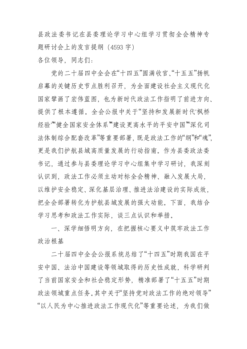 县政法委书记在县委理论学习中心组学习贯彻全会精神专题研讨会上的发言提纲(4593字)各位领导,同志们:党的二十届四中全会在“十四五”圆满收官、“十五五”扬帆启幕的关键历史节点胜利召开,为全面建设社会主义现代化国家擘画了宏伟蓝图,也为新时代政法工作指明了前进方向、提供了根本遵循。全会公报中关于“坚持和发展新时代枫桥经验“健全国家安全体系建设更高水平的平安中国“深化司法体制综合配套改革”等重要部署,既是政法工作的“纲和“魂”,更是我们护航县域高质量发展的行动指南。作为县委政法委书记,通过参与县委理论学习中心组集中学习研讨,我深刻认识到,政法工作必须主动对标全会精神、融入发展大局,以维护安全稳定、深化基层治理、推进法治建设的实际成效,把全会部署转化为护航县域发展的强大动能。下面,我结合学习思考和政法工作实际,谈三点认识和举措。一、深学细悟明方向,在把握核心要义中筑牢政法工作政治根基二十届四中全会公报系统总结了“十四五”时期我国在平安中国、法治中国建设等领域取得的历史性成就,科学研判了当前国家安全和社会稳定形势,精准部署了“十五五”时期政法领域重点任务。其中关于“坚持党对政法工作的绝对领导”“以人民为中心推进政法工作现代化”等重要论述,为我们做好新时代县域政法工作提供了根本遵循。政法机关作为人民民主专政的国家政权机关,必须先学一步、学深一层,深刻把握全会精神的核心要义和实践要求,确保政法工作始终沿着正确政治方向前进。一是锚定“两个确立”根本遵循,把准政治方向。全会始终贯穿以总书记同志为核心的党中央坚强领导这条主线,反复强调要深刻领悟“两个确立”的决定性意义,这是政法工作的生命线,更是维护县域安全稳定的定盘星。我们建立了“政法委领学+政法各单位研学+基层干警导学+党员自学”的四维学习机制,组织全县政法系统干部职工系统学习全会公报、《中共中央关于制定国民经济和社会发展第十五个五年规划的建议》及总书记总书记关于政法工作的重要论述,通过开展“政法干部讲坛“案例研讨交流会”等活动,推动全县政法干警把“两个维护”落实到执法司法全过程各方面。在理论武装中,我们把“两个确立”作为核心要义,制定《全会精神政法系统宣讲实施方案》,组建由县委常委、政法委书记带头,法院、检察院、公安局、司法局主要负责同志参与的宣讲团,分层次向政法干警、基层干部、群众代表开展专题宣讲;在执法司法实践中,将贯彻落实党中央关于政法工作的决策部署作为根本政治任务,确保政法工作始终与党中央同频共振。二是紧扣“高质量发展”首要任务,找准服务定位。全会明确提出“十五五”时期经济社会发展必须坚持高质量发展主
