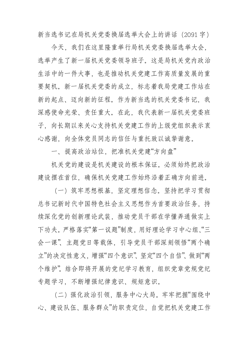 新当选书记在局机关党委换届选举大会上的讲话(2091字)今天,我们在这里隆重举行局机关党委换届选举大会,选举产生了新一届机关党委领导班子。这是局机关党内政治生活中的一件大事,也是推动机关党建工作高质量发展的重要契机。新一届机关党委的成立,标志着我局党建工作站在新的起点、迈向新的征程。作为新当选的机关党委书记,我深感使命光荣、责任重大。在此,我代表新一届机关党委班子,向长期以来关心支持机关党建工作的上级党组织表示衷心感谢,向全体党员同志的信任与重托致以诚挚谢意。一、提高政治站位,把准机关党建“方向盘”机关党的建设是机关建设的根本保证。必须始终把政治建设摆在首位,确保机关党建工作始终沿着正确方向前进。(一)筑牢思想根基,坚定理想信念。坚持把学习贯彻总书记新时代中国特色社会主义思想作为首要政治任务,持续深化党的创新理论武装,推动党员干部在学懂弄通做实上下功夫。严格落实“第一议题”制度,用好理论学习中心组、“三会一课”主题党日等载体,引导党员干部深刻领悟“两个确立”的决定性意义,增强“四个意识”坚定“四个自信”、做到“两个维护”结合即将开展的党纪学习教育,组织党章党规党纪专题学习,不断增强纪律意识、规矩意识。(二)强化政治引领,服务中心大局。牢牢把握“围绕中心、建设队伍、服务群众”的职责定位,自觉把机关党建工作放到全市发展大局中去谋划和推进。紧扣本部门主责主业,找准党建与业务深度融合的切入点和着力点,做到中心工作推进到哪里,党建工作就跟进到哪里,党组织的战斗堡垒作用和党员的先锋模范作用就发挥到哪里。教育引导党员干部胸怀“国之大者”自觉对标对表党中央决策部署和省委、市委工作要求,确保政令畅通、执行有力。(三)夯实组织基础,提升党建质效。深入贯彻《中国共产党支部工作条例(试行)》,持续推进党支部标准化规范化建设,严格落实组织生活制度,增强党内政治生活的政治性、时代性、原则性、战斗性。加强对党支部工作的分类指导和督导检查,推动各支部全面进步、全面过硬。注重在急难险重任务一线考察识别干部,把政治素质好、业务能力强、群众基础牢的优秀党员选拔到党务工作岗位上来,打造一支高素质专业化党务干部队伍。二、聚焦主责主业,激活机关党建“动力源”党建工作做实了就是生产力,做细了就是凝聚力,做强了就是战斗力。必须坚持党建与业务同频共振、互促共进,切实把党建优势转化为发展优势。(一)在推动发展上见真章。紧紧围绕本单位承担的重点任务,组织开展“党员先锋岗”业务攻坚队”等创先争优活动,激励党员干部在深化改革、创新驱动、优化服务等工作中勇挑重担、争当先锋。聚焦群众反映强烈的堵点难点问题,深