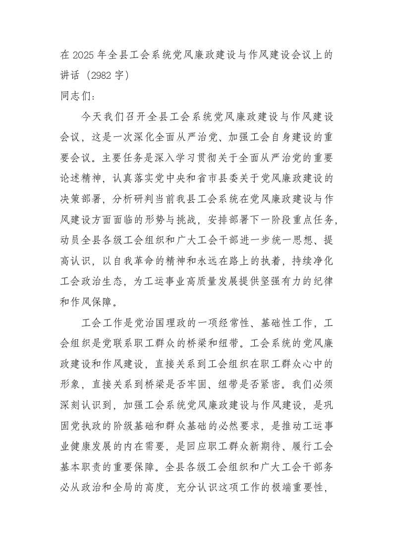 在2025年全县工会系统党风廉政建设与作风建设会议上的讲话(2982字)同志们:今天我们召开全县工会系统党风廉政建设与作风建设会议,这是一次深化全面从严治党、加强工会自身建设的重要会议。主要任务是深入学习贯彻关于全面从严治党的重要论述精神,认真落实党中央和省市县委关于党风廉政建设的决策部署,分析研判当前我县工会系统在党风廉政建设与作风建设方面面临的形势与挑战,安排部署下一阶段重点任务,动员全县各级工会组织和广大工会干部进一步统一思想、提高认识,以自我革命的精神和永远在路上的执着,持续净化工会政治生态,为工运事业高质量发展提供坚强有力的纪律和作风保障。工会工作是党治国理政的一项经常性、基础性工作,工会组织是党联系职工群众的桥梁和纽带。工会系统的党风廉政建设和作风建设,直接关系到工会组织在职工群众心中的形象,直接关系到桥梁是否牢固、纽带是否紧密。我们必须深刻认识到,加强工会系统党风廉政建设与作风建设,是巩固党执政的阶级基础和群众基础的必然要求,是推动工运事业健康发展的内在需要,是回应职工群众新期待、履行工会基本职责的重要保障。全县各级工会组织和广大工会干部务必从政治和全局的高度,充分认识这项工作的极端重要性,切实增强责任感、使命感和紧迫感,以更高的标准、更严的要求、更实的举措,把党风廉政建设和作风建设不断引向深入。近年来,在县委和上级工会的坚强领导下,全县工会系统始终坚持把党风廉政建设和作风建设摆在突出位置,层层压实责任,持续正风肃纪,取得了阶段性成效。我们坚持把党的政治建设摆在首位,引导工会干部深刻领悟“两个确立”的决定性意义,增强“四个意识”坚定“四个自信”做到“两个维护”始终在思想上政治上行动上同党中央保持高度一致。我们持续深化理论武装,用党的创新理论指导工会工作实践,干部队伍的思想政治基础不断夯实。我们严格执行纪律规定,坚决纠治“四风”问题,特别是形式主义、官僚主义得到一定遏制,工会工作作风有所转变。我们不断健全完善制度机制,围绕经费管理、资产监管、工程项目、采购招标等关键领域,扎紧制度笼子,规范权力运行,廉政风险防控能力得到提升。我们强化监督执纪问责,严肃查处了一些违规违纪问题,保持了惩治腐败的高压态势。这些成绩的取得,是全县工会系统共同努力的结果,为我们进一步推进全面从严治党奠定了坚实基础。在肯定成绩的同时,我们更要清醒地看到,与党中央的要求和职工群众的期盼相比,我县工会系统党风廉政建设和作风建设仍存在一些不容忽视的问题和薄弱环节。有的工会