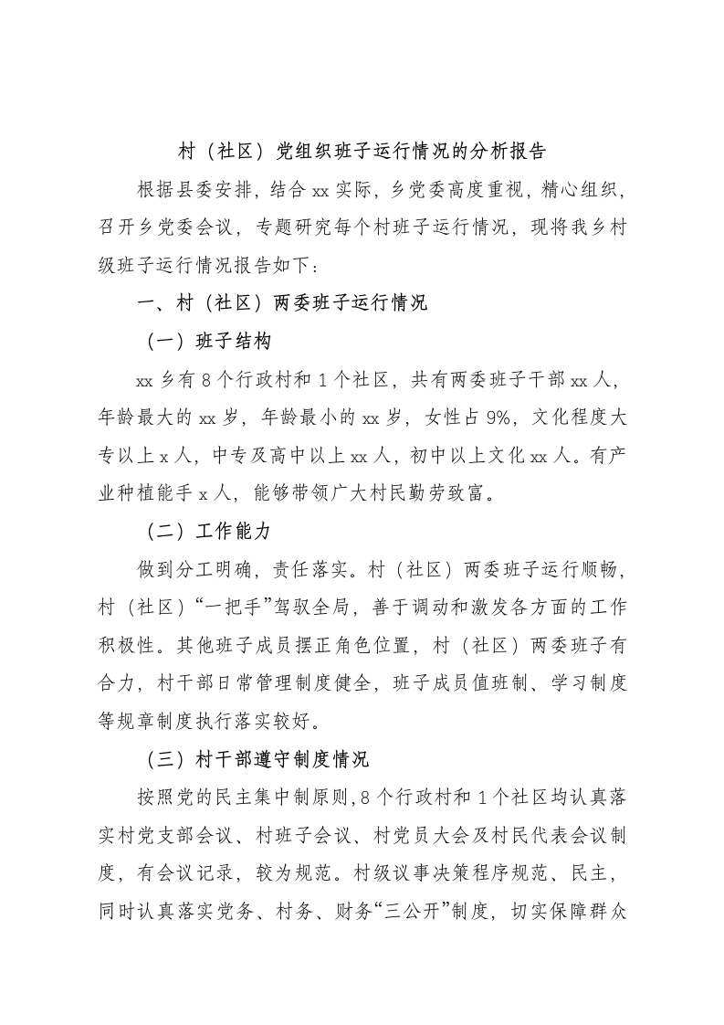 村(社区)党组织班子运行情况的分析报告根据县委安排,结合双实际,乡党委高度重视,精心组织,召开乡党委会议,专题研究每个村班子运行情况,现将我乡村级班子运行情况报告如下:一、村(社区)两委班子运行情况(一)班子结构燃乡有8个行政村和1个社区,共有两委班子干部双人,年龄最大的x燃岁,年龄最小的燃岁,女性占9%,文化程度大专以上x人,中专及高中以上x人,初中以上文化双人。有产业种植能手x人,能够带领广大村民勤劳致富。(二)工作能力做到分工明确,责任落实。村(社区)两委班子运行顺畅,村(社区)“一把手”驾驭全局,善于调动和激发各方面的工作积极性。其他班子成员摆正角色位置,村(社区)两委班子有合力,村干部日常管理制度健全,班子成员值班制、学习制度等规章制度执行落实较好。(三)村干部遵守制度情况按照党的民主集中制原则,8个行政村和1个社区均认真落实村党支部会议、村班子会议、村党员大会及村民代表会议制度,有会议记录,较为规范。村级议事决策程序规范、民主,同时认真落实党务、村务、财务“三公开”制度,切实保障群众的民主权利,落实发展党员和后备干部计划,执行民主推荐、考察培养、公示票决等有关规定。(四)村(社区)两委干部工作实绩情况村(社区)两委均制定落实了村级班子年度工作目标承诺制,村干部岗位目标责任制,并向群众公开,自觉接受群众监督,积极为群众排忧解难,加强社会管理,提高服务水平,各村(社区)和谐稳定。(五)村后备干部队伍建设情况为进一步解决后继无人的问题,村(社区)至少培养2名后备干部,村(社区)两委班子成员配备齐全,班子结构后继有人。(六)乡党委对村(社区)两委班子综合评价全乡8个行政村和1个社区两委班子运行健康,能及时贯彻中央、省、市、县方针、政策,能够充分发挥村级组织带头作用,能够较好地完成党委、政府交办的各项工作任务,积极谋划,班子成员分工明确,积极配合,领导群众发展产业,干群关系和谐,基层战斗堡垒攻效不断展现,工作业绩突出,各项业务按时完成,对脱贫攻坚工作主动谋划,因人因户施策,按序时进度完成了贫困户退出机制,推动了脱贫攻坚工作的顺利开展。今年1一6月全乡贫困户退出113户318人。二、存在的问题