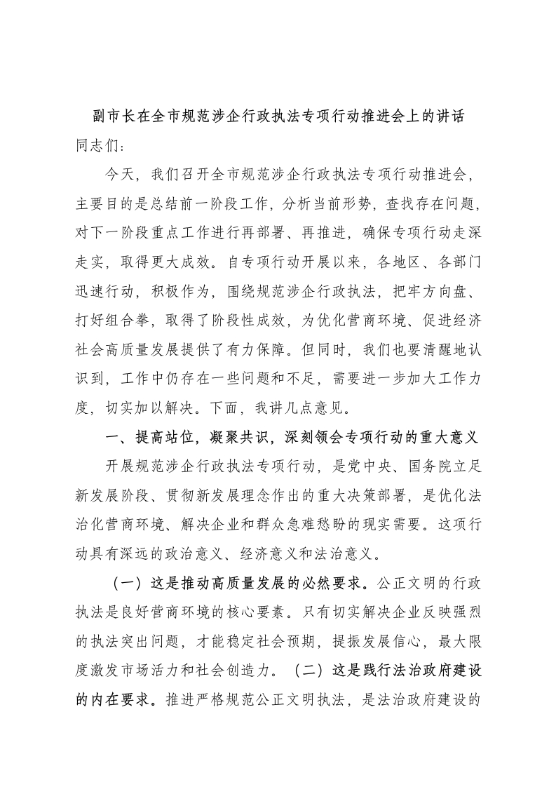 副市长在全市规范涉企行政执法专项行动推进会上的讲话同志们:今天,我们召开全市规范涉企行政执法专项行动推进会,主要目的是总结前一阶段工作,分析当前形势,查找存在问题,对下一阶段重点工作进行再部署、再推进,确保专项行动走深走实,取得更大成效。自专项行动开展以来,各地区、各部门迅速行动,积极作为,围绕规范涉企行政执法,把牢方向盘、打好组合拳,取得了阶段性成效,为优化营商环境、促进经济社会高质量发展提供了有力保障。但同时,我们也要清醒地认识到,工作中仍存在一些问题和不足,需要进一步加大工作力度,切实加以解决。下面,我讲几点意见。一、提高站位,凝聚共识,深刻领会专项行动的重大意义开展规范涉企行政执法专项行动,是党中央、国务院立足新发展阶段、贯彻新发展理念作出的重大决策部署,是优化法治化营商环境、解决企业和群众急难愁盼的现实需要。这项行动具有深远的政治意义、经济意义和法治意义。(一)这是推动高质量发展的必然要求。公正文明的行政执法是良好营商环境的核心要素。只有切实解决企业反映强烈的执法突出问题,才能稳定社会预期,提振发展信心,最大限度激发市场活力和社会创造力。(二)这是践行法治政府建设的内在要求。推进严格规范公正文明执法,是法治政府建设的重中之重。专项行动直指执法中的顽瘴痼疾,是提升行政执法公信力和执法效能的关键举措。(三)这是回应人民群众关切的实际行动。执法不规范、不公正、不文明等问题,不仅损害企业合法权益,也侵蚀政府公信力。我们必须以刀刃向内的勇气,坚决纠治这些问题,让企业和群众感受到公平正义就在身边。各县(区)、市级各行政执法部门要切实把思想和行动统一到中央和省委、省政府的决策部署上来,统一到市委、市政府的工作要求上来,深刻认识开展专项行动的极端重要性和现实紧迫性,切实增强责任感和使命感,以更高的标准、更严的要求、更实的举措,打好这场攻坚战。二、肯定成效,正视问题,准确把握专项行动的阶段性特征前期,在大家的共同努力下,我市专项行动取得了初步成效。我们聚焦重点问题开展了集中整治,清理整顿了执法队伍,查处了一批突出问题,为企业挽回了一定的经济损失。各地在探索“综合查一次”、“扫码入企”、非现场执法等新型监管模式方面也进行了有益尝试,旨在有效减少对企业不必要的干扰。这些成绩值得肯定。然而,对照高标准严要求,我们的工作仍存在一些短板和不足。例如,问题线索排查不够深入全面,部分单位存在“等靠要”思想;执法不规范现象仍时有发生,尤其是