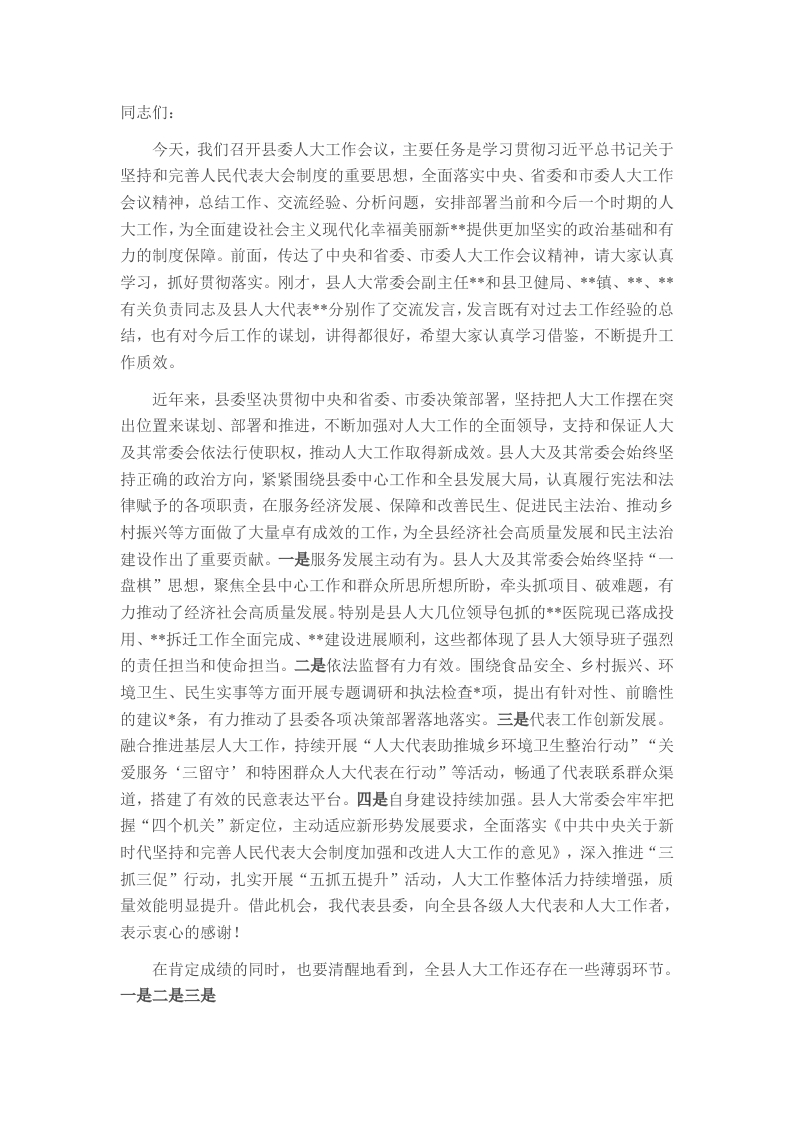 同志们:今天,我们召开县委人大工作会议,主要任务是学习贯彻习近平总书记关于坚持和完善人民代表大会制度的重要思想,全面落实中央、省委和市委人大工作会议精神,总结工作、交流经验、分析问题,安排部署当前和今后一个时期的人大工作,为全面建设社会主义现代化幸福美丽新**提供更加坚实的政治基础和有力的制度保障。前面,传达了中央和省委、市委人大工作会议精神,请大家认真学习,抓好贯彻落实。刚才,县人大常委会副主任*和县卫健局、*镇、*、*有关负责同志及县人大代表*分别作了交流发言,发言既有对过去工作经验的总结,也有对今后工作的谋划,讲得都很好,希望大家认真学习借鉴,不断提升工作质效。近年来,县委坚决贯彻中央和省委、市委决策部署,坚持把人大工作摆在突出位置来谋划、部署和推进,不断加强对人大工作的全面领导,支持和保证人大及其常委会依法行使职权,推动人大工作取得新成效。县人大及其常委会始终坚持正确的政治方向,紧紧围绕县委中心工作和全县发展大局,认真履行宪法和法律赋予的各项职责,在服务经济发展、保障和改善民生、促进民主法治、推动乡村振兴等方面做了大量卓有成效的工作,为全县经济社会高质量发展和民主法治建设作出了重要贡献。一是服务发展主动有为。县人大及其常委会始终坚持“一盘棋”思想,聚焦全县中心工作和群众所思所想所盼,牵头抓项目、破难题,有力推动了经济社会高质量发展。特别是县人大几位领导包抓的**医院现已落成投用、**拆迁工作全面完成、*建设进展顺利,这些都体现了县人大领导班子强烈的责任担当和使命担当。二是依法监督有力有效。围绕食品安全、乡村振兴、环境卫生、民生实事等方面开展专题调研和执法检查*项,提出有针对性、前瞻性的建议*条,有力推动了县委各项决策部署落地落实。三是代表工作创新发展。融合推进基层人大工作,持续开展“人大代表助推城乡环境卫生整治行动”“关爱服务‘三留守’和特困群众人大代表在行动”等活动,畅通了代表联系群众渠道,搭建了有效的民意表达平台。四是自身建设持续加强。县人大常委会牢牢把握“四个机关”新定位,主动适应新形势发展要求,全面落实《中共中央关于新时代坚持和完善人民代表大会制度加强和改进人大工作的意见》,深入推进“三抓三促”行动,扎实开展“五抓五提升”活动,人大工作整体活力持续增强,质量效能明显提升。借此机会,我代表县委,向全县各级人大代表和人大工作者,表示衷心的感谢!在肯定成绩的同时,也要清醒地看到,全县人大工作还存在一些薄弱环节。一是二是三是下面,就做好新时代全县人大工作,我强调三个方面的意见。第一个方面,强化思想引领,以更高站位把牢正确方向做好新时代人大工作,必须坚持以习近平新时代中国特色社会主义思想为指导,深刻认识和把握习近平总书记关于人民代表大会制度的重要论述精神,主动从党的创新理论中找方向、找智慧、找方法,确保人大工作始终沿着正确的政治方向前进。一要深刻感悟思想伟力。党的十八大以来,以习近平同志为核心的党中央高度重视人大制度建设和人大工作,推动人民代表大会制度理论和实践创新取得重大成果。在中央人大工作会议上,习近平总书记明确提出“六个必须坚持”(即:必须坚持中国共产党领导:必须坚持用制度体系保障人民当家作主:必须坚持全面依法治国:必须坚持民主集中制:必须坚持中国特色社会主义政治发展道路:必须坚持推进国家治理体系和治理能力现代化),精辟概括了人民代表大会制度的主要特征,拓展深化了人民代表大会制度的科学内涵,形成了习近平总书记关于坚持和完善人民代表大会制度的重要思想,为做好新时代人大工作提供了根本遵循。我们要深入学习领会,切实增强贯彻落实的思想自觉、政治自觉、行动自觉,创造性地开展工作,真正把人民代表大会制度坚持好、完善好、发展好。二要始终坚定制度自信。改革开放40多年来的实践充分证明,人民代表大会制度能够有效保证国家沿着社会主义道路前进,有效保证国家治理跳出治乱兴衰历史周期率,有效保证国家政治生活既充满活力又安定有序,是我们党领导人民在人类政治制度史上的伟大创造,具有显著优越性和强大生命力。我们要始终保持战略定力,更加坚定中国特色社会主义政治制度自信和道路自信,始终坚持党的领导、人民当家作主、依法治国有机统一,与时俱进完善人民代表大会制度,充分调动各方面的积极因素,为**改革发展凝聚更强大的合力。三要主动担负时代使命。习近平总书记指出,人民代表大会制度是中国特色社会主义制度的重要组成部分,是支撑中国国家治理体系和治理能力的根本政治制度。我们要切实肩负起新时代新征程赋予人大的新使命新任务,自觉把人大工作放在全局中思考,置于大局下推动,聚焦县委确定的大事、群众关心的要事、改革发展的难事,以敢抓敢干、敢闯敢拼、敢作敢为的劲头,切实担负起宪法法律赋予的职责,着力加强宪法法律实施和监督,不断提升重大事项决定的权威性、人大监督的实效性和干部任免的严肃性,更好地把人民代表大会制度优势转化为治理效能和发展成果。第二个方面,积极主动作为,以更强担当服务发展大局