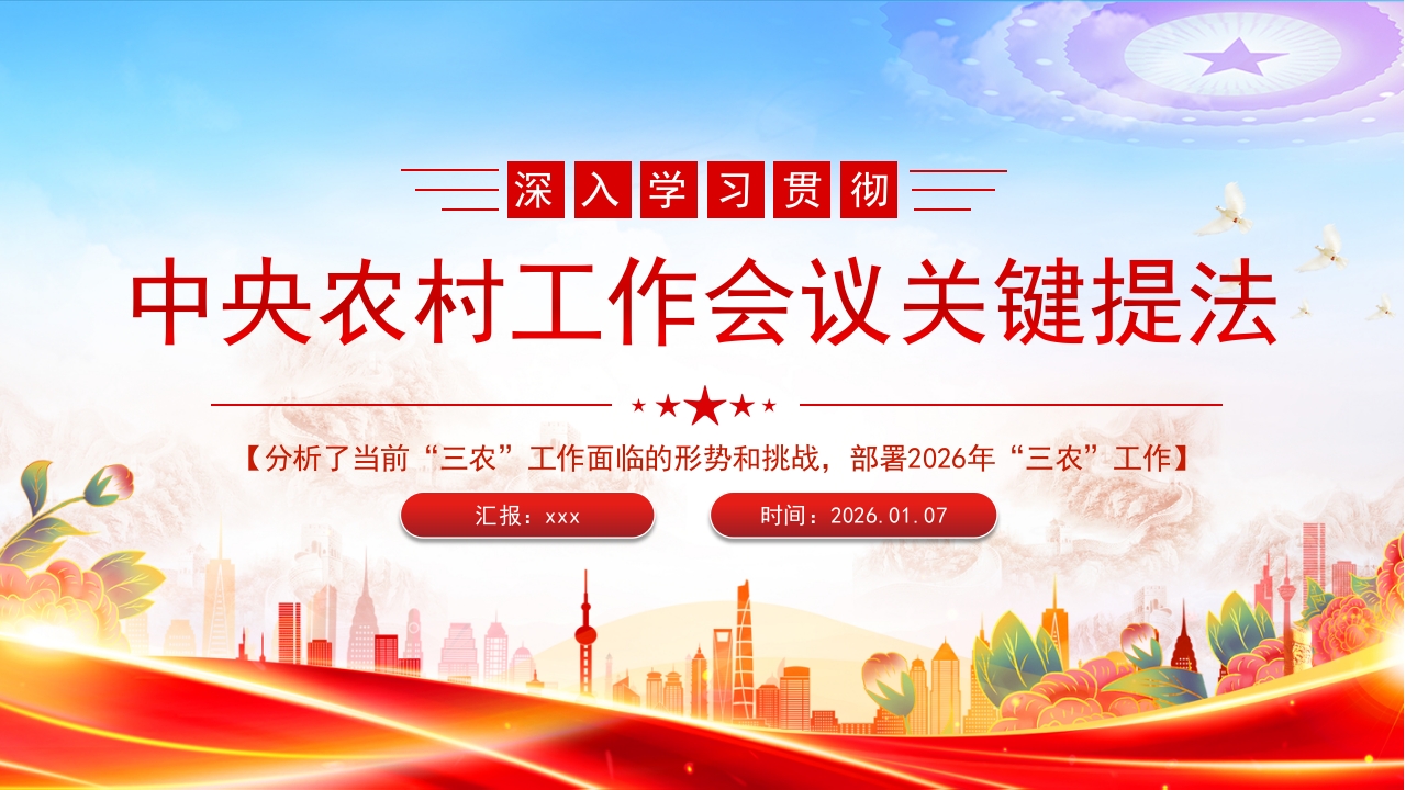 三深入学习贯彻中央农村工作会议关键提法【分析了当前“三农”工作面临的形势和挑战,部署2026年“三农”工作】时间:2026.01.07前言中央农村工作会议29日至30日在北京召开。会议以习近平新时代中国特色社会主义思想为指导,深入贯彻党的二十大和二十届历次全会精神,全面贯彻习近平总书记关于“三农”工作的重要论述和重要指示精神,落实中央经济工作会议精神,分析当前“三农”工作面临的形势和挑战,部署2026年“三农”工作。