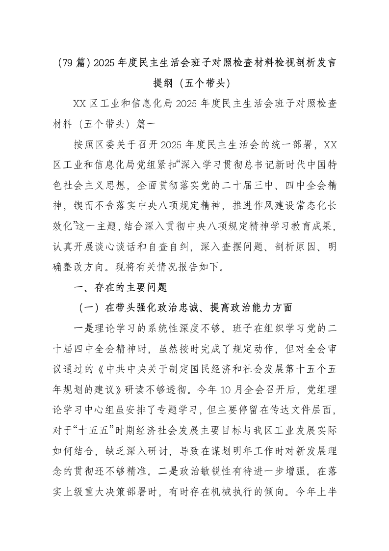(79篇)2025年度民主生活会班子对照检查材料检视剖析发言提纲(五个带头)X区工业和信息化局2025年度民主生活会班子对照检查材料(五个带头)篇一按照区委关于召开2025年度民主生活会的统一部署,XX区工业和信息化局党组紧扣“深入学习贯彻总书记新时代中国特色社会主义思想,全面贯彻落实党的二十届三中、四中全会精神,锲而不舍落实中央八项规定精神,推进作风建设常态化长效化这一主题,结合深入贯彻中央八项规定精神学习教育成果,认真开展谈心谈话和自查自纠,深入查摆问题、剖析原因、明确整改方向。现将有关情况报告如下。一、存在的主要问题(一)在带头强化政治忠诚、提高政治能力方面一是理论学习的系统性深度不够。班子在组织学习党的二十届四中全会精神时,虽然按时完成了规定动作,但对全会审议通过的《中共中央关于制定国民经济和社会发展第十五个五年规划的建议》研读不够透彻。今年10月全会召开后,党组理论学习中心组虽安排了专题学习,但主要停留在传达文件层面,对于“十五五”时期经济社会发展主要目标与我区工业发展实际如何结合,缺乏深入研讨,导致在谋划明年工作时对新发展理念的贯彻还不够精准。二是政治敏锐性有待进一步增强。在落实上级重大决策部署时,有时存在机械执行的倾向。今年上半年,省里部署推进新型工业化相关工作,班子在制定实施方案时,对标对表不够主动,存在等上级细化要求的思想。在推进制造业数字化转型工作中,对工信部印发的《信息化和工业化融合2025年工作要点》学习研究不够及时,在落实"人工智能+制造"行动方面行动迟缓,工作部署滞后于兄弟县区。三是政治站位把握还不够精准。在研究工业经济发展问题时,有时过于关注经济指标完成情况,对贯彻新发展理念、推动高质量发展的政治要求理解把握不够到位。年初在讨论全区规上工业增加值目标时,部分班子成员偏重于数量增长,对如何通过产业结构优化提升发展质量关注不足,在推进传统产业改造升级与培育新兴产业协调发展方面思路不够清晰。(二)在带头固本培元、增强党性方面一是思想淬炼的自觉性不够强。在参加深入贯彻中央八项规定精神学习教育过程中,部分班子成员对学习教育的重大意义认识不够深刻,存在应付过关的思想。今年3月至7月开展学习教育期间,个别同志把学习教育简单理解为读文件、写心得,对总书记总书记关于加强党的作风建设的重要论述学习不够系统,未能真正做到入脑入心、融会贯通。二是理想信念教育的针对性有待加强。班子在组织党性教育活动时,形式较为单一,主要以集中学习、观看专题片为主,缺乏结合工信系统特点开展的针对性教育。今年组织党员干部参观红色教育基地时,行程安排较为紧凑,学习交流时间不足,