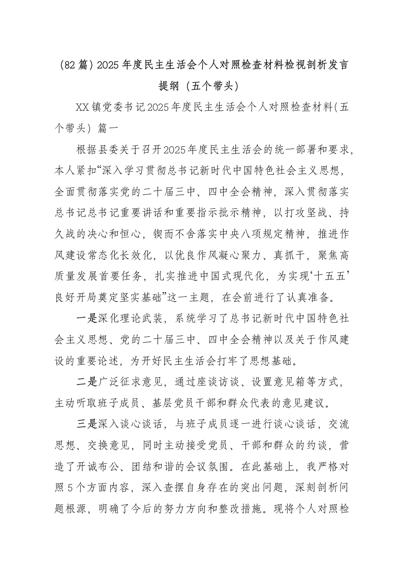 (82篇)2025年度民主生活会个人对照检查材料检视剖析发言提纲(五个带头)X镇党委书记2025年度民主生活会个人对照检查材料(五个带头)篇一根据县委关于召开2025年度民主生活会的统一部署和要求,本人紧扣“深入学习贯彻总书记新时代中国特色社会主义思想,全面贯彻落实党的二十届三中、四中全会精神,深入贯彻落实总书记总书记重要讲话和重要指示批示精神,以打攻坚战、持久战的决心和恒心,锲而不舍落实中央八项规定精神,推进作风建设常态化长效化,以优良作风凝心聚力、真抓干,聚焦高质量发展首要任务,扎实推进中国式现代化,为实现‘十五五良好开局奠定坚实基础”这一主题,在会前进行了认真准备。一是深化理论武装,系统学习了总书记新时代中国特色社会主义思想、党的二十届三中、四中全会精神以及关于作风建设的重要论述,为开好民主生活会打牢了思想基础。二是广泛征求意见,通过座谈访谈、设置意见箱等方式,主动听取班子成员、基层党员干部和群众代表的意见建议。三是深入谈心谈话,与班子成员逐一进行谈心谈话,交流思想、交换意见,同时主动接受党员、干部和群众的约谈,营造了开诚布公、团结和谐的会议氛围。在此基础上,我严格对照5个方面内容,深入查摆自身存在的突出问题,深刻剖析问题根源,明确了今后的努力方向和整改措施。现将个人对照检查情况报告如下。一、深入贯彻中央八项规定精神学习教育整改整治情况及上年度民主生活会整改落实情况(一)深入贯彻中央八项规定精神学习教育整改整治情况在近期开展的深入贯彻中央八项规定精神学习教育中,我始终以高度的政治自觉投入其中,坚持把自己摆进去、把职责摆进去、把工作摆进去,通过个人自查、组织点题、群众反映等方式,共查摆出在改进调查研究、精简会议文件、厉行勤俭节约等8个方面11个具体问题。针对这些问题,我坚持即知即改、立行立改,制定了个人整改清单,明确了整改措施和时限。针对过去调研中存在“走过场、摆样子”的问题,我深刻反思,并在后续工作中带头改进,要求调研必须带着问题去、奔着实效来,坚决杜绝“盆景式”调研。在推进特色农业产业发展工作中,我多次不打招呼、直插现场,深入田间地头与烟农、椒农深入交流,掌握了产业发展的第一手资料,推动解决了烤烟种植技术培训不足、辣椒销售渠道单一等实际困难。针对“会议发言中存在空话套话多”的问题,我带头要求发言必须言简意赅、直面问题,汇报工作要多讲数据、多谈办法,少讲客套话、少穿靴戴帽。截至目前,查摆出的11个问题已全部整改完成,并长期坚持。通过此次学习教育和整改整治,我个人在思想认识上得到了再深化,在党性修养上得到了再锤炼,在工作作风上得到了再改进,有效推动了全镇作风建设向纵深发展。