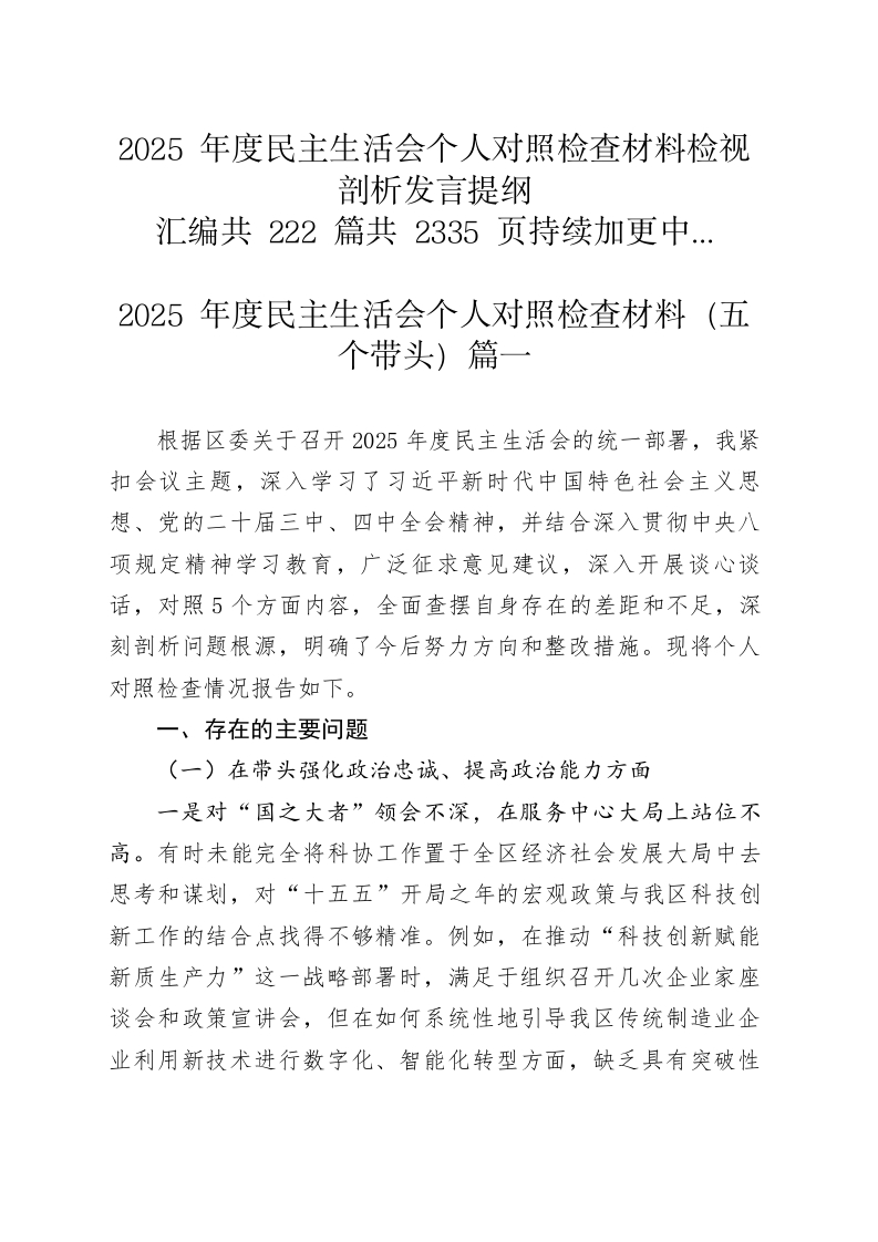 2025年度民主生活会个人对照检查材料检视剖析发言提纲汇编共222篇共2335页持续加更中.2025年度民主生活会个人对照检查材料(五个带头)篇一根据区委关于召开2025年度民主生活会的统一部署,我紧扣会议主题,深入学习了习近平新时代中国特色社会主义思想、党的二十届三中、四中全会精神,并结合深入贯彻中央八项规定精神学习教育,广泛征求意见建议,深入开展谈心谈话,对照5个方面内容,全面查摆自身存在的差距和不足,深刻剖析问题根源,明确了今后努力方向和整改措施。现将个人对照检查情况报告如下。一、存在的主要问题(一)在带头强化政治忠诚、提高政治能力方面一是对“国之大者”领会不深,在服务中心大局上站位不高。有时未能完全将科协工作置于全区经济社会发展大局中去思考和谋划,对“十五五”开局之年的宏观政策与我区科技创新工作的结合点找得不够精准。例如,在推动“科技创新赋能新质生产力”这一战略部署时,满足于组织召开几次企业家座谈会和政策宣讲会,但在如何系统性地引导我区传统制造业企业利用新技术进行数字化、智能化转型方面,缺乏具有突破性的具体路径和长效机制,导致政策宣贯的热度未能有效转化为企业发展的加速度。二是对“两个确立”感悟不透,在执行决策部署上标准不严。能够始终在思想上、政治上、行动上同党中央保持高度一致,但在将上级决策部署转化为具体工作举措时,偶尔存在“等一等、看一看”的思想,执行的创造性和主动性有待加强。比如,在落实省、市科协关于深化基层科协组织改革的要求中,虽然按时完成了方案制定和机构调整,但在激发乡镇(街道)科协活力、延伸服务触角方面,更多是“照方抓药”,未能充分结合我区各乡镇产业特色和科技需求,打造出具有辨识度的“一地一品”基层科协服务品牌,使得改革的“后半篇文章”做得不够扎实。三是对“政治三力”锤炼不够,在防范化解风险上敏锐不足。对意识形态领域的复杂性认识不足,对科技领域可能出现的风险挑战预见性不强。在日常工作中,对科普宣传内容的政治性、科学性、严谨性把关虽然有制度规定,但在实际操作中有时会过度依赖业务部门的初审。去年在审核一篇关于人工智能发展的科普推文时,仅关注了其科学知识的普及性,对其可能引发的社会伦理讨论和潜在的舆论风险点未能提前预判和加以引导,反映出政治判断力、政治领悟力、政治执行力仍需在实践中持续锤炼。(二)在带头固本培元、增强党性方面