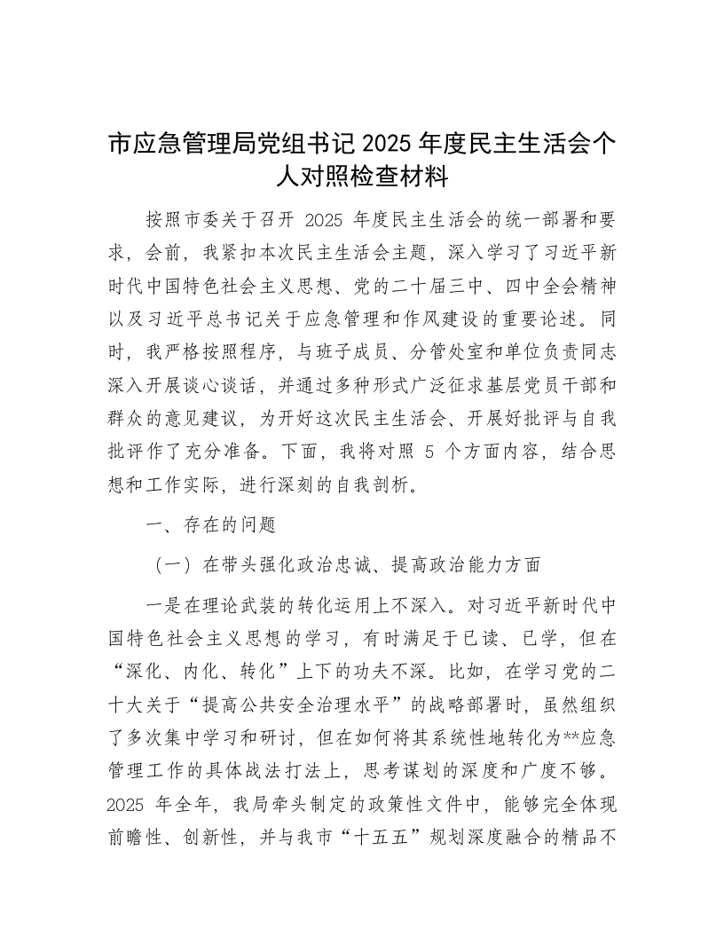 市应急管理局党组书记2025年度民主生活会个人对照检查材料按照市委关于召开2025年度民主生活会的统一部署和要求,会前,我紧扣本次民主生活会主题,深入学习了习近平新时代中国特色社会主义思想、党的二十届三中、四中全会精神以及习近平总书记关于应急管理和作风建设的重要论述。同时,我严格按照程序,与班子成员、分管处室和单位负责同志深入开展谈心谈话,并通过多种形式广泛征求基层党员干部和群众的意见建议,为开好这次民主生活会、开展好批评与自我批评作了充分准备。下面,我将对照5个方面内容,结合思想和工作实际,进行深刻的自我剖析。一、存在的问题(一)在带头强化政治忠诚、提高政治能力方面一是在理论武装的转化运用上不深入。对习近平新时代中国特色社会主义思想的学习,有时满足于已读、已学,但在“深化、内化、转化”上下的功夫不深。比如,在学习党的二十大关于“提高公共安全治理水平”的战略部署时,虽然组织了多次集中学习和研讨,但在如何将其系统性地转化为*应急管理工作的具体战法打法上,思考谋划的深度和广度不够。2025年全年,我局牵头制定的政策性文件中,能够完全体现前瞻性、创新性,并与我市“十五五”规划深度融合的精品不多,这说明我从政治高度将党的创新理论转化为推动高质量发展具体实践的能力不强。二是在贯彻上级决策部署的执行力度上有温差。对中央、省委和市委的决策部署,能够做到闻令而动、坚决执行,但在具体落实过程中,存在结合实际不够、跟踪问效不紧的问题。特别是在推动应急管理数字化转型方面,尽管市委市政府多次强调要打破数据壁垒,提升智慧治理能力,但我局的“智慧应急”平台建设仍存在“上热下冷”现象。在2025年夏季防汛期间,我局“智慧应急”平台与水利、气象等部门的数据共享仍存在壁垒,部分关键水库的实时水位和泄洪数据未能实现秒级共享,导致在几次强降雨过程的会商研判中,我们对下游乡镇的预警发布延迟了约30分钟,虽然未造成重大灾害,但暴露了贯彻落实上级决策部署时存在的“最后一公里”梗阻问题。三是在防范化解重大风险的政治敏锐性上不强烈。身为应急局“班长”,对潜在的风险挑战虽有警觉,但有时敏锐性不强,洞察力不足。2025年全市生产安全事故起数和死亡人数虽实现“双下降”,截至11月底,事故起数和死亡人数同比分别下降5.3%和6.5%,但对一些苗头性、倾向性问题背后的政治风险认识不深刻。例如,对新业态、新领域安全监管的研究严重不足,面对“剧本杀”、“密室逃脱”等新兴业态,我对其消防安全、人员疏散等方面的风险研究不深不透。2025
