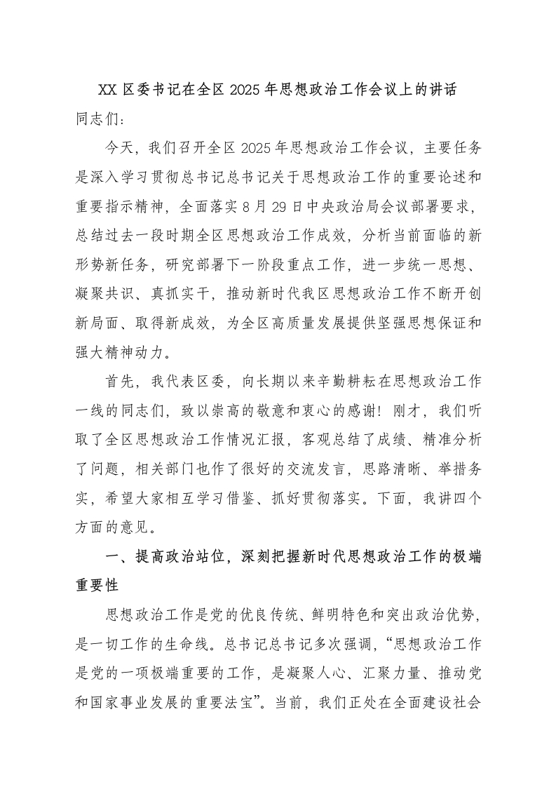 X区委书记在全区2025年思想政治工作会议上的讲话同志们:今天,我们召开全区2025年思想政治工作会议,主要任务是深入学习贯彻总书记总书记关于思想政治工作的重要论述和重要指示精神,全面落实8月29日中央政治局会议部署要求,总结过去一段时期全区思想政治工作成效,分析当前面临的新形势新任务,研究部署下一阶段重点工作,进一步统一思想、凝聚共识、真抓实干,推动新时代我区思想政治工作不断开创新局面、取得新成效,为全区高质量发展提供坚强思想保证和强大精神动力。首先,我代表区委,向长期以来辛勤耕耘在思想政治工作一线的同志们,致以崇高的敬意和衷心的感谢!刚才,我们听取了全区思想政治工作情况汇报,客观总结了成绩、精准分析了问题,相关部门也作了很好的交流发言,思路清晰、举措务实,希望大家相互学习借鉴、抓好贯彻落实。下面,我讲四个方面的意见。一、提高政治站位,深刻把握新时代思想政治工作的极端重要性思想政治工作是党的优良传统、鲜明特色和突出政治优势,是一切工作的生命线。总书记总书记多次强调,“思想政治工作是党的一项极端重要的工作,是凝聚人心、汇聚力量、推动党和国家事业发展的重要法宝”。当前,我们正处在全面建设社会主义现代化国家的关键时期,我区也面临着转型升级、爬坡过坎的重要阶段,做好新时代思想政治工作,具有特殊而重要的意义。(一)做好新时代思想政治工作,是坚定拥护“两个确立”、坚决做到“两个维护”的必然要求“两个确立”是新时代取得一切成就最根本的保证,“两个维护”是最高的政治原则和根本的政治规矩。思想政治工作的核心任务,就是要引导全区广大党员干部群众深刻领悟“两个确立”的决定性意义,把“两个维护”体现在思想上、落实到行动上。近年来,我们始终把学习贯彻总书记新时代中国特色社会主义思想作为首要政治任务,通过党委(党组)理论学习中心组学习、专题研讨、基层宣讲等多种形式,推动党的创新理论进企业、进农村、进机关、进校园、进社区、进网络,全区上下在思想上政治上行动上同以总书记同志为核心的党中央保持高度一致的政治自觉不断增强。但我们也要清醒认识到,意识形态领域的斗争依然复杂严峻,各种错误思潮和不实信息时有出现,必须通过强有力的思想政治工作,筑牢信仰之基、补足精神之钙、把稳思想之舵,确保全区各项工作始终沿着党中央指引的正确方向前进。(二)做好新时代思想政治工作,是服务全区高质量发展大局的迫切需要发展是党执政兴国的第一要务,也是我区当前最大的政治、最核心的任务。当前,我区正全力推进产业升级、