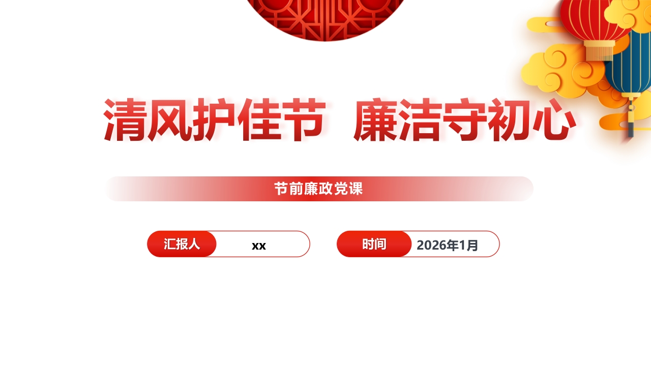 清风护佳节廉洁守初心节前廉政党课汇报人XX时间2026年1月前言俗话说:“廉不廉,看过年;洁不洁,看过节。每逢佳节,是公众观察党风政风的敏感时期,更是作风建设的重要关口。重视人情往来,节日互送礼品,本是民间传统,但部分“别有心机”的人却把正常的礼尚往来变成唯权、唯上、唯私的“单边献礼”,把送礼视为拉关系的最佳机遇,把尚礼仪与谋利益划上等号,借过节之名,行贿赂之实,不仅污染了健康的节日气氛,扭曲了民俗民风,更成为导致腐败的“糖衣炮弹”
