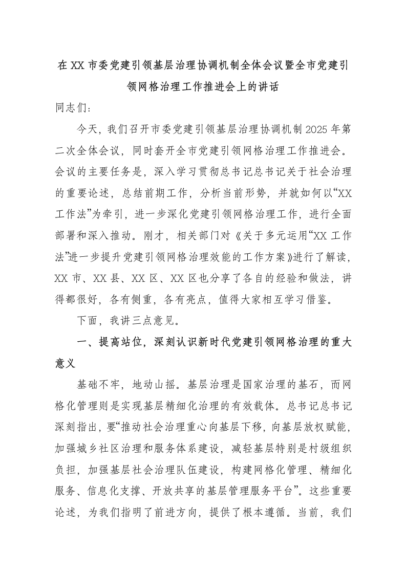 在X市委党建引领基层治理协调机制全体会议暨全市党建引领网格治理工作推进会上的讲话同志们:今天,我们召开市委党建引领基层治理协调机制2025年第二次全体会议,同时套开全市党建引领网格治理工作推进会。会议的主要任务是,深入学习贯彻总书记总书记关于社会治理的重要论述,总结前期工作,分析当前形势,并就如何以“XX工作法”为牵引,进一步深化党建引领网格治理工作,进行全面部署和深入推动。刚才,相关部门对《关于多元运用“XX工作法进一步提升党建引领网格治理效能的工作方案》进行了解读,XX市、XX县、XX区、XX区也分享了各自的经验和做法,讲得都很好,各有侧重,各有亮点,值得大家相互学习借鉴。下面,我讲三点意见。一、提高站位,深刻认识新时代党建引领网格治理的重大意义基础不牢,地动山摇。基层治理是国家治理的基石,而网格化管理则是实现基层精细化治理的有效载体。总书记总书记深刻指出,要“推动社会治理重心向基层下移,向基层放权赋能,加强城乡社区治理和服务体系建设,减轻基层特别是村级组织负担,加强基层社会治理队伍建设,构建网格化管理、精细化服务、信息化支撑、开放共享的基层管理服务平台”。这些重要论述,为我们指明了前进方向,提供了根本遵循。当前,我们正处在社会结构深刻变动、利益格局深刻调整、思想观念深刻变化的关键时期,各类新情况、新问题层出不穷,对基层治理的能力和水平提出了前所未有的挑战。在这样的时代背景下,加强和创新党建引领下的网格治理,不仅是落实中央决策部署的政治要求,更是应对风险挑战、维护社会稳定、增进民生福祉的现实需要。首先,这是夯实党的执政根基的必然要求。党的领导是中国特色社会主义最本质的特征,也是社会治理的“定盘星”和“主心骨”。历史和实践反复证明,只有坚持党的全面领导,将党的政治优势、组织优势转化为治理效能,才能确保基层治理始终沿着正确的方向前进。网格虽小,却是党和国家联系服务群众的“最后一公里”,是感知社会脉搏的“神经末梢”。通过将党组织建在网格上、让党员沉到网格中,我们能够把党的路线方针政策精准有效地传递到千家万户,把群众的急难愁盼及时准确地反映上来,从而在最基层筑牢党群“连心桥”,巩固党在基层的执政基础。其次,这是推进治理体系和治理能力现代化的关键之举。党的二十大报告明确提出,要“健全共建共治共享的社会治理制度,提升社会治理效能”。从“管理”到“治理”,一字之差,体现的是治理理念的深刻变革。网格化治理不是简单的区域划分和任务分割,而是一种系统性、整体性的治理模式重塑。它要求我们打破过去“九龙治水”、各自为战的局面,以党建为统领,