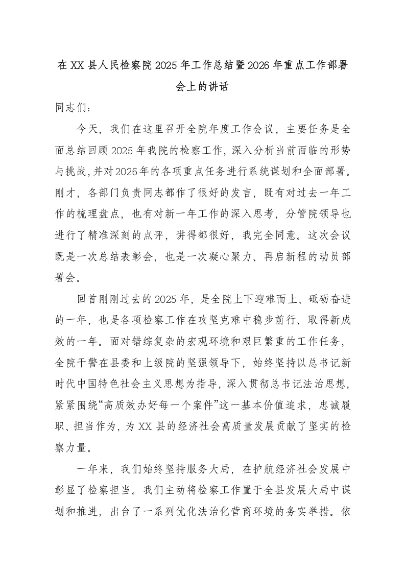 在XX县人民检察院2025年工作总结暨2026年重点工作部署会上的讲话同志们:今天,我们在这里召开全院年度工作会议,主要任务是全面总结回顾2025年我院的检察工作,深入分析当前面临的形势与挑战,并对2026年的各项重点任务进行系统谋划和全面部署。刚才,各部门负责同志都作了很好的发言,既有对过去一年工作的梳理盘点,也有对新一年工作的深入思考,分管院领导也进行了精准深刻的点评,讲得都很好,我完全同意。这次会议既是一次总结表彰会,也是一次凝心聚力、再启新程的动员部署会。回首刚刚过去的2025年,是全院上下迎难而上、砥砺奋进的一年,也是各项检察工作在攻坚克难中稳步前行、取得新成效的一年。面对错综复杂的宏观环境和艰巨繁重的工作任务,全院干警在县委和上级院的坚强领导下,始终坚持以总书记新时代中国特色社会主义思想为指导,深入贯彻总书记法治思想,紧紧围绕“高质效办好每一个案件”这一基本价值追求,忠诚履职、担当作为,为XX县的经济社会高质量发展贡献了坚实的检察力量。一年来,我们始终坚持服务大局,在护航经济社会发展中彰显了检察担当。我们主动将检察工作置于全县发展大局中谋划和推进,出台了一系列优化法治化营商环境的务实举措。依法严厉打击破坏市场经济秩序犯罪,共批准逮捕相关案件X件X人,提起公诉X件X人,有效维护了公平竞争的市场环境。深化涉案企业合规改革,对X家涉案企业启动合规考察程序,帮助企业“死而复生”,实现了司法办案“三个效果”的有机统一。我们积极参与社会治理,针对办案中发现的行业性、普遍性问题,制发社会治理类检察建议X份,均得到相关单位的采纳和整改,实现了“办理一案、治理一片”的良好效果。一年来,我们始终坚持司法为民,在解决群众急难愁盼中传递了检察温度。我们用心用情办好每一件群众身边的小案,努力让人民群众在每一个司法案件中感受到公平正义。全年共受理群众信访X件次,首次信访化解率达到92%以上,我们的“民心”工程建设取得了实质性进展。持续深化未成年人综合司法保护,严厉打击侵害未成年人犯罪,同时,我们推动“一站式”取证救助中心实质化运行,最大限度减少了“二次伤害”。积极开展司法救助工作,为XX名因案致贫的被害人及其家属发放救助金XX万元,让司法既有力度,更有温度。在公益诉讼领域,我们聚焦生态环境、食品药品安全等重点领域,立案办理公益诉讼案件X件,守护了碧水蓝天和百姓舌尖上的安全。一年来,我们始终坚持监督主业,在维护司法公平正义中展现了检察作为。我们深刻把握“四大检察”全面协调充分发展的内在要求,不断提升法律监督的质效和刚性。刑事检察方面,我们坚持罪刑法定、疑罪从无原则,依法不批捕X人、不起诉