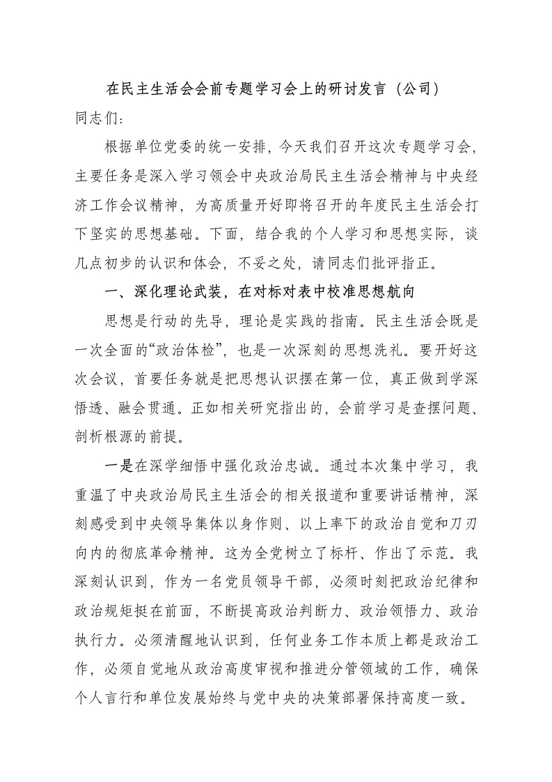 在民主生活会会前专题学习会上的研讨发言(公司)同志们:根据单位党委的统一安排,今天我们召开这次专题学习会,主要任务是深入学习领会中央政治局民主生活会精神与中央经济工作会议精神,为高质量开好即将召开的年度民主生活会打下坚实的思想基础。下面,结合我的个人学习和思想实际,谈几点初步的认识和体会,不妥之处,请同志们批评指正。一、深化理论武装,在对标对表中校准思想航向思想是行动的先导,理论是实践的指南。民主生活会既是一次全面的“政治体检”,也是一次深刻的思想洗礼。要开好这次会议,首要任务就是把思想认识摆在第一位,真正做到学深悟透、融会贯通。正如相关研究指出的,会前学习是查摆问题、剖析根源的前提。一是在深学细悟中强化政治忠诚。通过本次集中学习,我重温了中央政治局民主生活会的相关报道和重要讲话精神,深刻感受到中央领导集体以身作则、以上率下的政治自觉和刀刃向内的彻底革命精神。这为全党树立了标杆、作出了示范。我深刻认识到,作为一名党员领导干部,必须时刻把政治纪律和政治规矩挺在前面,不断提高政治判断力、政治领悟力、政治执行力。必须清醒地认识到,任何业务工作本质上都是政治工作,必须自觉地从政治高度审视和推进分管领域的工作,确保个人言行和单位发展始终与党中央的决策部署保持高度一致。二是在联系实际中感悟思想伟力。学习的目的全在于运用。我坚持把自己摆进去、把职责摆进去、把工作摆进去对照中央政治局民主生活会精神和中央经济工作会议提出的新要求、新部署,反复检视自身的思想差距和行动偏差。比如,在学习中央经济工作会议精神时,我不仅关注与*公司业务直接相关的产业政策和金融导向,更深入思考会议提出的“稳中求进、以进促稳、先立后破”等重要原则,如何在我个人的思想深处扎根,并转化为指导实际工作的思维方法。我认识到,这要求我在推动业务创新时,既要有敢闯敢试的“进”,也要有对风险的敬畏和对规律的尊重,防止脱离实际的冒进。三是在反躬自省中查找认知不足。通过学习,我愈发感到理论学习永无止境,思想改造永无止境。我反思自己,虽然能够坚持参加党委理论学习中心组的集体学习,但有时在个人自学上还存在“碎片化”和“实用主义”的倾向。比如,对一些新理论、新论断的学习,有时停留在“知其然”的层面,对其时代背景、深刻内涵和实践要求的“所以然”钻研得不够深、不够透。这种学习上的欠缺,直接影响了思想认识的高度和工作谋划的深度,这是我必须正视并加以改进的。二、坚持问题导向,以动真碰硬的态度剖析自我民主生活会的核心在于严肃开展批评和自我批评。自我批评必须要有勇气和担当,敢于揭短亮丑,触及思想和灵魂的深处。对照学习内容和党员标准,结合同志们在会前谈心谈话中