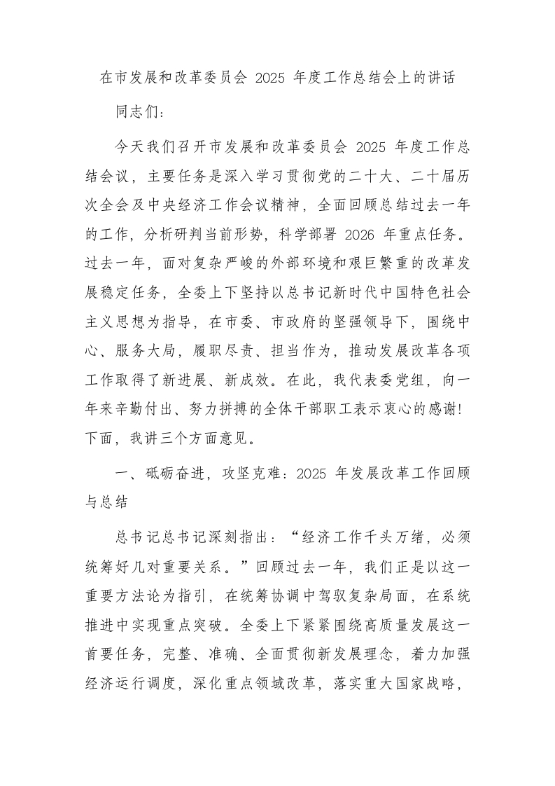 在市发展和改革委员会2025年度工作总结会上的讲话同志们:今天我们召开市发展和改革委员会2025年度工作总结会议,主要任务是深入学习贯彻党的二十大、二十届历次全会及中央经济工作会议精神,全面回顾总结过去一年的工作,分析研判当前形势,科学部署2026年重点任务。过去一年,面对复杂严峻的外部环境和艰巨繁重的改革发展稳定任务,全委上下坚持以总书记新时代中国特色社会主义思想为指导,在市委、市政府的坚强领导下,围绕中心、服务大局,履职尽责、担当作为,推动发展改革各项工作取得了新进展、新成效。在此,我代表委党组,向一年来辛勤付出、努力拼搏的全体干部职工表示衷心的感谢!下面,我讲三个方面意见。一、砥砺奋进,攻坚克难:2025年发展改革工作回顾与总结总书记总书记深刻指出:“经济工作千头万绪,必须统筹好几对重要关系。”回顾过去一年,我们正是以这一重要方法论为指引,在统筹协调中驾驭复杂局面,在系统推进中实现重点突破。全委上下紧紧围绕高质量发展这一首要任务,完整、准确、全面贯彻新发展理念,着力加强经济运行调度,深化重点领域改革,落实重大国家战略,推动全市经济实现了质的有效提升和量的合理增长。在“十四五”规划收官的关键之年,我们的工作为全市经济社会发展大局提供了坚实支撑,也为“十五五”顺利开局奠定了坚实基础。(一)聚焦主责主业,经济运行在精准调控中稳中向好我们深刻认识到,发展是解决一切问题的基础和关键。做好经济工作的综合协调与调控,是我们的核心职能。过去一年,我们始终坚持稳中求进工作总基调,加强经济形势的穿透式分析和前瞻性研判,建立健全跨部门协同调度机制,精准发力、综合施策,有效应对了外部压力传导和内部结构性矛盾,确保了全市经济大盘的稳定。一是强化监测调度,筑牢经济稳增长根基。我们始终将稳增长放在突出位置,不断健全经济运行监测预警体系。通过构建高频数据跟踪、重点行业扫描、龙头企业直报相结合的多维分析框架,我们实现了对经济态势的实时感知和深度把脉。针对经济运行中的苗头性、倾向性问题,我们牵头建立了跨部门联合会商机制,按月按季开展精准调度,特别是强化了对工业、服务业、投资、消费等关键领域的靶向分析。我们动态评估宏观政策效应,牵头制定并推动实施了一系列具有本市特色的稳增长政策包,注重政策工具的创新和协同,例如,我们优化了专项债券的“自审自发”流程,