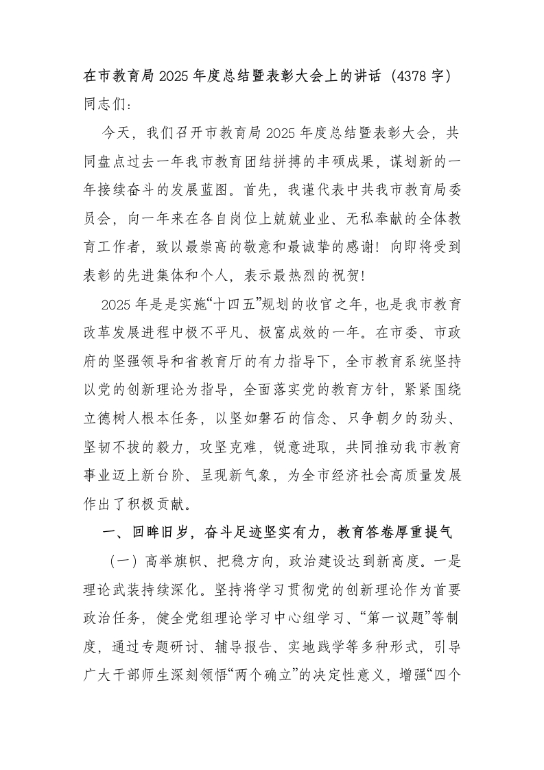 在市教育局2025年度总结暨表彰大会上的讲话(4378字)同志们:今天,我们召开市教育局2025年度总结暨表彰大会,共同盘点过去一年我市教育团结拼搏的丰硕成果,谋划新的一年接续奋斗的发展蓝图。首先,我谨代表中共我市教育局委员会,向一年来在各自岗位上兢兢业业、无私奉献的全体教育工作者,致以最崇高的敬意和最诚挚的感谢!向即将受到表彰的先进集体和个人,表示最热烈的祝贺!2025年是是实施“十四五”规划的收官之年,也是我市教育改革发展进程中极不平凡、极富成效的一年。在市委、市政府的坚强领导和省教育厅的有力指导下,全市教育系统坚持以党的创新理论为指导,全面落实党的教育方针,紧紧围绕立德树人根本任务,以坚如磐石的信念、只争朝夕的劲头、坚韧不拔的毅力,攻坚克难,锐意进取,共同推动我市教育事业迈上新台阶、呈现新气象,为全市经济社会高质量发展作出了积极贡献。一、回眸旧岁,奋斗足迹坚实有力,教育答卷厚重提气(一)高举旗帜、把稳方向,政治建设达到新高度。一是理论武装持续深化。坚持将学习贯彻党的创新理论作为首要政治任务,健全党组理论学习中心组学习、“第一议题”等制度,通过专题研讨、辅导报告、实地践学等多种形式,引导广大干部师生深刻领悟“两个确立”的决定性意义,增强“四个意识”、坚定“四个自信”、做到“两个维护”。党的路线方针政策在全市教育系统不折不扣得到贯彻落实,确保了教育事业发展的正确政治方向。二是党建引领坚强有力。全面加强党对教育工作的领导,严格落实全面从严治党主体责任和意识形态工作责任制。扎实推进基层党组织标准化规范化建设,教师党支部书记“双带头人”培育工程成效显著。深化党风廉政建设,锲而不舍落实中央八项规定及其实施细则精神,持续整治形式主义、官僚主义,教育政治生态更加风清气正。(二)聚焦主业、担当作为,教育发展实现新跨越。一是立德树人根本任务全面落实。深入推进“大思政课”建设,构建“三全育人”新格局。社会主义核心价值观教育融入教育教学全过程,学生思想道德素质和文明素养持续提升。劳动教育、心理健康教育、法治教育全面加强,育人载体更加丰富。二是基础教育资源供给持续扩大。面对学龄人口高峰,迎难而上,新建、改扩建中小学(幼儿园)48所,新增优质学位4.25万个,有力缓解了“入学难”问题。城镇小区配套幼儿园治理成果持续丸固,普惠性学前教育资源供给更加充分。三是各级各类教育发展更加协调。义务教育优质均衡发展扎实推进,集团化办学、学区制管理覆盖面进一步扩大。普通高中多样化有特色发展步伐加快,新建、改扩建普通高中项目进展顺利。职业教育适应性增强,产教融合、校企合作深度拓展。特殊教育、继续教育、民办教育规范健康发展。四是