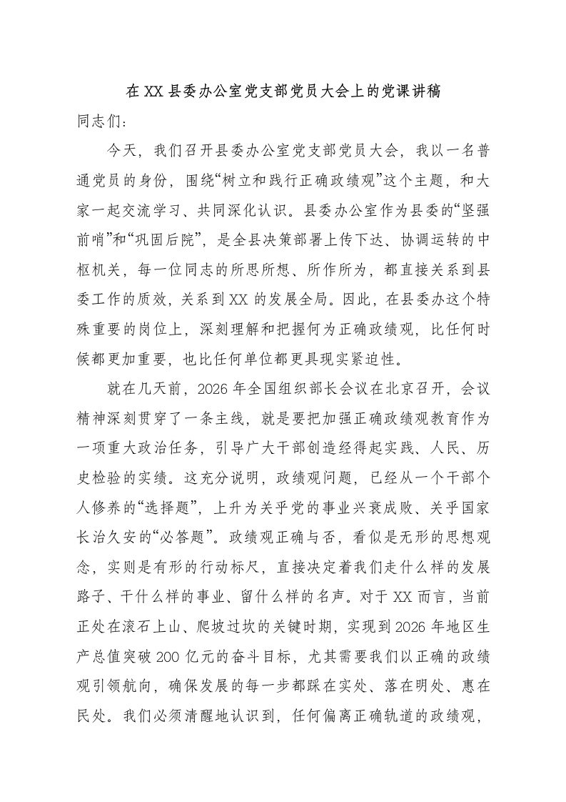 在X县委办公室党支部党员大会上的党课讲稿同志们:今天,我们召开县委办公室党支部党员大会,我以一名普通党员的身份,围绕“树立和践行正确政绩观”这个主题,和大家一起交流学习、共同深化认识。县委办公室作为县委的“坚强前哨”和“巩固后院”,是全县决策部署上传下达、协调运转的中枢机关,每一位同志的所思所想、所作所为,都直接关系到县委工作的质效,关系到X的发展全局。因此,在县委办这个特殊重要的岗位上,深刻理解和把握何为正确政绩观,比任何时候都更加重要,也比任何单位都更具现实紧迫性。就在几天前,2026年全国组织部长会议在北京召开,会议精神深刻贯穿了一条主线,就是要把加强正确政绩观教育作为一项重大政治任务,引导广大干部创造经得起实践、人民、历史检验的实绩。这充分说明,政绩观问题,已经从一个干部个人修养的“选择题”,上升为关乎党的事业兴衰成败、关乎国家长治久安的“必答题”。政绩观正确与否,看似是无形的思想观念,实则是有形的行动标尺,直接决定着我们走什么样的发展路子、干什么样的事业、留什么样的名声。对于X而言,当前正处在滚石上山、爬坡过坎的关键时期,实现到2026年地区生产总值突破200亿元的奋斗目标,尤其需要我们以正确的政绩观引领航向,确保发展的每一步都踩在实处、落在明处、惠在民处。我们必须清醒地认识到,任何偏离正确轨道的政绩观,比如曾经发生在我们身边的统计数据失真问题,其根源都是发展观、政绩观的扭曲,带来的教训是极其深刻的。因此,今天这堂党课,既是贯彻落实中央最新精神的政治要求,也是结合X实际、深化自我革命的现实需要。如何校准我们的政绩观?我认为,可以借助六面“镜子”,时常进行自我观照、自我检视、自我剖析,从而照鉴初心、廓清迷雾、把准方向。第一,要善用“透视镜”,校准“为谁树绩”的价值原点“透视镜”的功能是洞察本质。政绩观的本质是什么?就是“政绩为谁而树”这个根本性问题。是为一己私利、个人升迁,还是为人民幸福、民族复兴?这是检验一名共产党员党性纯不纯、立场稳不稳的试金石。共产党人的初心和使命,就是为中国人民谋幸福,为中华民族谋复兴。离开了“人民”二字,一切政绩都将失去其应有的光彩和分量。县委办公室的同志身处核心岗位,接触的工作都是关乎全县发展大局和民生福祉的要事。大家起草的每一份文件,核校的每一篇君,协调的每一次会议,都可能影响一项政策的落地、一个项目的推进、一个群体的利益。在这个过程中,必须时刻用“透视镜”审视自己的内心,看看我们的出发点和落脚点,究竟是放在了“让领导满意”还是“让群众满意”上,是放在了“材料漂亮”还是“事情办好”上,是放在了“个人前途”还是“XX前途”上。真正的政绩,从来不是写在纸上、挂在墙上、说在嘴上的,而