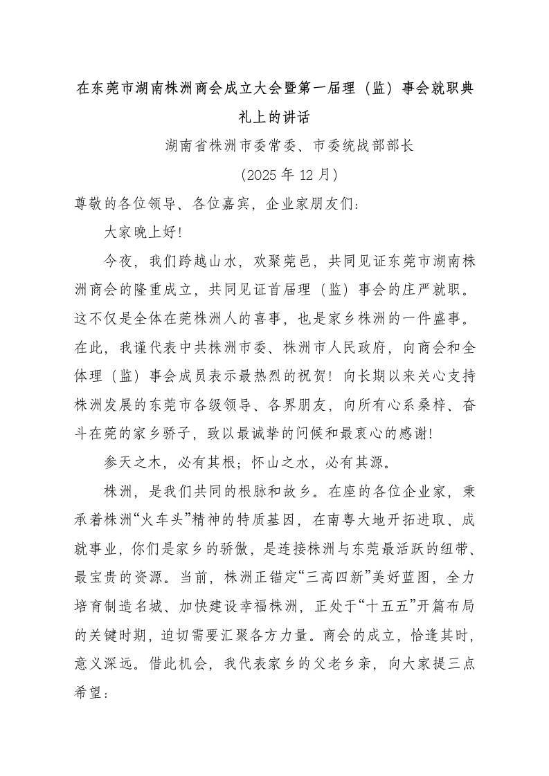 在东莞市湖南株洲商会成立大会暨第一届理(监)事会就职典礼上的讲话湖南省株洲市委常委、市委统战部部长(2025年12月)尊敬的各位领导、各位嘉宾,企业家朋友们:大家晚上好!今夜,我们跨越山水,欢聚莞邑,共同见证东莞市湖南株洲商会的隆重成立,共同见证首届理(监)事会的庄严就职。这不仅是全体在莞株洲人的喜事,也是家乡株洲的一件盛事。在此,我谨代表中共株洲市委、株洲市人民政府,向商会和全体理(监)事会成员表示最热烈的祝贺!向长期以来关心支持株洲发展的东莞市各级领导、各界朋友,向所有心系桑梓、奋斗在莞的家乡骄子,致以最诚挚的问候和最衷心的感谢!参天之木,必有其根;怀山之水,必有其源。株洲,是我们共同的根脉和故乡。在座的各位企业家,秉承着株洲“火车头”精神的特质基因,在南粤大地开拓进取、成就事业,你们是家乡的骄傲,是连接株洲与东莞最活跃的纽带、最宝贵的资源。当前,株洲正锚定“三高四新”美好蓝图,全力培育制造名城、加快建设幸福株洲,正处于“十五五”开篇布局的关键时期,迫切需要汇聚各方力量。商会的成立,恰逢其时,意义深远。借此机会,我代表家乡的父老乡亲,向大家提三点希望:一、同心筑梦,建好团结引领“主阵地”。希望商会坚持政治引领、团结立会,把广大在莞乡亲紧密团结起来,画好最大同心圆。要引导会员企业坚定发展信心,守法诚信经营,主动融入发展大局。要大力弘扬湘商精神和株洲企业家的优良传统,通过乡音乡情凝聚人心,把商会建设成为在莞株洲人信赖、依靠的温暖之家、奋进之家、共赢之家。二、同向发力,当好株莞发展“连心桥”。商会是两地经贸合作、人文交流的重要平台。希望大家既做东莞繁荣的优秀建设者,也当好株洲发展的最佳“代言人”。要积极宣传株洲的发展变化、产业优势、营商环境,讲好株洲故事、传播株洲好声音,引导更多项目、技术、资金和人才回归家乡。同时,也希望大家把沿海的开放理念、创新经验、市场渠道引入株洲,助力家乡产业转型升级和高质量发展。三、同担使命,擦亮株商在莞“金名片”。广大企业家是社会财富的创造者,也是社会责任的担当者。希望商会引导会员企业富而思源、回报桑梓,积极参与公益事业、乡村振兴和共同富裕的伟大实践,展现株洲企业家的深厚情怀与时代担当。同时,也希望大家弘扬企业家精神,坚守主业、做强实业、做精专业,争做胸怀报国志、一心谋发展、守法善经营、先富促共富的典范。各位朋友,走得再远,家乡永远是你们最坚实的后盾;飞得再高,株洲永远是你们最温暖的港湾。市委、市政府将一如