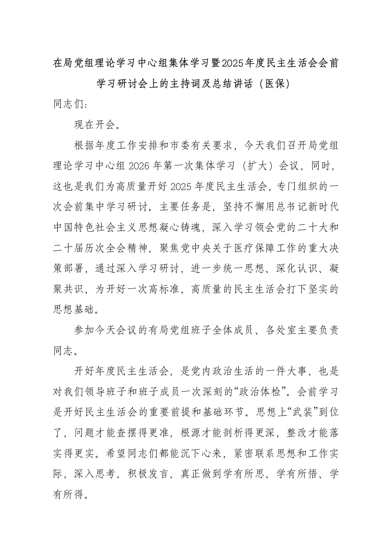 在局党组理论学习中心组集体学习暨2025年度民主生活会会前学习研讨会上的主持词及总结讲话(医保)同志们:现在开会。根据年度工作安排和市委有关要求,今天我们召开局党组理论学习中心组2026年第一次集体学习(扩大)会议,同时,这也是我们为高质量开好2025年度民主生活会,专门组织的一次会前集中学习研讨。主要任务是,坚持不懈用总书记新时代中国特色社会主义思想凝心铸魂,深入学习领会党的二十大和二十届历次全会精神,聚焦党中央关于医疗保障工作的重大决策部署,通过深入学习研讨,进一步统一思想、深化认识、凝聚共识,为开好一次高标准、高质量的民主生活会打下坚实的思想基础。参加今天会议的有局党组班子全体成员、各处室主要负责同志。开好年度民主生活会,是党内政治生活的一件大事,也是对我们领导班子和班子成员一次深刻的“政治体检”。会前学习是开好民主生活会的重要前提和基础环节。思想上“武装”到位了,问题才能查摆得更准,根源才能剖析得更深,整改才能落实得更实。希望同志们都能沉下心来,紧密联系思想和工作实际,深入思考、积极发言,真正做到学有所思、学有所悟、学有所得。今天的会议有两项议程:一是请部分班子成员和处室负责同志,围绕学习主题作重点交流发言;二是由我作总结讲话。下面,进行会议第一项议程,请同志们作交流发言。(发言过程)同志们,刚才x位同志的发言,紧扣学习主题,紧密联系工作,谈了认识、讲了体会、说了打算,有理论高度、有思想深度、有实践维度,听了很受启发。这充分说明,大家对这次学习是高度重视的,是做了认真准备的。这次学习研讨,主题鲜明、内容聚焦、氛围浓厚,达到了预期的目的。下面,结合大家的发言,并围绕如何将学习成果转化为开好民主生活会、推动医保工作的实际成效,我再讲三点意见。一、深化思想认识,在“为何学”上筑牢政治根基理论上清醒,政治上才能坚定。我们党依靠学习走到今天,也必然要依靠学习走向未来。在年度民主生活会前,专门安排一次集中学习,其意义不仅在于“完成规定动作”,更在于通过理论大学习、思想大武装,实现一次精神上的“集中补钙”和政治上的“精准对表”。(一)这是旗帜鲜明讲政治的“必修课”。医疗保障工作是政治性极强的业务工作,业务性极强的政治工作。我们管理的是人民群众的“看病钱“救命钱”,我们执行的每一项政策,都直接关系到群众的切身利益,关系到党和政府的形象。因此,我们必须时常叩问自己:是否深刻领悟“两个确立”的决定性意义?
