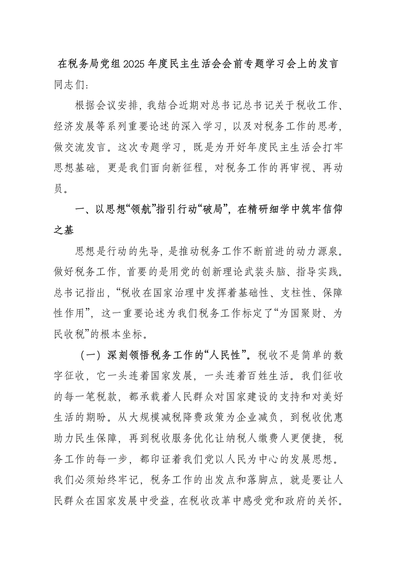 在税务局党组2025年度民主生活会会前专题学习会上的发言同志们:根据会议安排,我结合近期对总书记总书记关于税收工作、经济发展等系列重要论述的深入学习,以及对税务工作的思考,做交流发言。这次专题学习,既是为开好年度民主生活会打牢思想基础,更是我们面向新征程,对税务工作的再审视、再动员。一、以思想“领航”指引行动“破局”,在精研细学中筑牢信仰之基思想是行动的先导,是推动税务工作不断前进的动力源泉。做好税务工作,首要的是用党的创新理论武装头脑、指导实践。总书记指出,“税收在国家治理中发挥着基础性、支柱性、保障性作用”,这一重要论述为我们税务工作标定了“为国聚财、为民收税”的根本坐标。(一)深刻领悟税务工作的“人民性”。税收不是简单的数字征收,它一头连着国家发展,一头连着百姓生活。我们征收的每一笔税款,都承载着人民群众对国家建设的支持和对美好生活的期盼。从大规模减税降费政策为企业减负,到税收优惠助力民生保障,再到税收服务优化让纳税人缴费人更便捷,税务工作的每一步,都印证着我们党以人民为中心的发展思想。我们必须始终牢记,税务工作的出发点和落脚点,就是要让人民群众在国家发展中受益,在税收改革中感受党和政府的关怀。税务干部要将服务人民的理念贯穿工作始终,真正做到权为民所用、情为民所系、利为民所谋。(二)深刻领悟税务工作的“政治性”。税收是国家财政的重要来源,确保税收足额征收、合理使用,就是维护国家经济安全和社会稳定,这是一项重大政治任务。当前,税收征管面临着经济形势复杂多变、偷逃税手段隐薇多样等挑战。我们必须从政治高度看待税收征管问题,时刻绷紧政治这根弦。这要求我们不仅要有精湛的业务能力,更要有坚定的政治立场和对党、对人民高度负责的政治担当。任何在税收征管上的疏忽和懈怠,都是对国家利益的损害,是对政治责任的漠视。(三)深刻领悟税务工作的“时代性”。随着我国经济社会的快速发展和数字化时代的到来,人民群众对税收服务的需求从“有没有”转向“好不好”。新业态、新模式不断涌现,税收政策和征管方式也需要与时俱进。面对这些新形势新挑战,我们不能“故步自封”,更不能“因循守旧”。必须主动识变、应变、求变,以改革创新的精神,推动税收征管数字化转型、完善现代税收制度,让税收制度的发展成果更公平、更可持续地惠及全体人民。二、以问题“导向”校准工作“航线”,在对标对表中检视初心使命对照中央要求和纳税人缴费人期盼,我们必须清醒地认识到工作中存在的短板和不足。发现问题是能力,解决问题是担