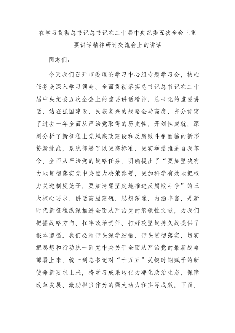 在学习贯彻总书记总书记在二十届中央纪委五次全会上重要讲话精神研讨交流会上的讲话同志们:今天我们召开市委理论学习中心组专题学习会,核心任务是深入学习领会、全面贯彻落实总书记总书记在二十届中央纪委五次全会上的重要讲话精神。总书记的重要讲话,站在强国建设、民族复兴的战略全局高度,充分肯定了过去一年全面从严治党取得的历史性、开创性成就,深刻分析了新征程上党风廉政建设和反腐败斗争面临的新形势新挑战,系统部署了以更高标准、更实举措推进自我革命、全面从严治党的战略任务,明确提出了“更加坚决有力地贯彻落实党中央重大决策部署,更加科学有效地把权力关进制度笼子,更加清醒坚定地推进反腐败斗争”的三大核心要求。讲话高屋建瓴、思想深邃、内涵丰富,是新时代新征程纵深推进全面从严治党的纲领性文献,为我们把握战略方向、扛牢政治责任、打好攻坚战持久战提供了根本遵循。我们必须带头深学细悟、带头贯彻落实,切实把思想和行动统一到党中央关于全面从严治党的最新战略部署上来,统一到总书记对“十五五”关键时期赋予的新使命新要求上来,将学习成果转化为净化政治生态、保障改革发展、激励担当作为的强大动力和实际成效。下面,结合我市实际和个人学习思考,我谈三点认识和贯彻落实意见。一、以纲举目张的贯通之效,坚决有力推动中央政令落地生根“贯彻落实党中央重大决策部署,是维护党中央权威和集中统一领导的根本要求,也是党和人民事业不断发展进步的重要历史经验。”“十五五”时期是我国基本实现社会主义现代化夯实基础、全面发力的关键时期,改革发展稳定任务艰巨繁重。越是形势复杂、任务艰巨,越要发挥党中央集中统一领导的“定海神针”作用,越要确保党中央的号令在本地畅通无阻、令行禁止。全市各级党组织和党员干部必须胸怀“国之大者”,增强贯彻落实的政治责任感、历史使命感,做党中央决策部署最坚定的执行者、行动派。(一)在政治监督具体化、精准化、常态化上下真功,确保方向不偏。政治监督是确保党中央决策部署落实的“第一道工序”。我们必须紧紧围绕总书记在讲话中明确指出的贯彻新发展理念、推动高质量发展、构建新发展格局、建设现代化产业体系、因地制宜发展新质生产力、建设全国统一大市场、统筹发展与安全等一系列重大战略任务,结合我市“十五五”规划实施和年度重点工作,将政治监督的“大命题”细化为一项项具体的“任务书”和