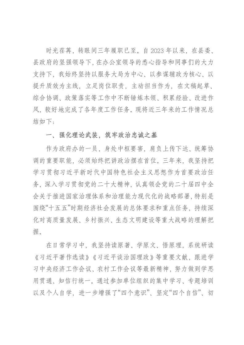 时光荏苒,转眼间三年履职已至。自2023年以来,在县委、县政府的坚强领导下,在办公室领导的悉心指导和同事们的大力支持下,我始终坚持以服务大局为中心、以参谋辅政为核心、以提升质效为主线,立足岗位职责,主动担当作为,在文稿起草、综合协调、政策落实等工作中不断锤炼本领、积累经验、改进作风,较好地完成了各年度工作任务。现将近三年来的工作情况总结如下:一、强化理论武装,筑牢政治忠诚之基作为政府办的一员,身处中枢要害,肩负上传下达、统筹协调的重要职能,必须始终把讲政治摆在首位。三年来,我坚持把学习贯彻习近平新时代中国特色社会主义思想作为首要政治任务,深入学习贯彻党的二十大精神,认真领会党的二十届四中全会关于推进国家治理体系和治理能力现代化的战略部署,特别是围绕“十五五”时期经济社会发展的总体要求和重点任务,持续深化对高质量发展、乡村振兴、生态文明建设等重大战略的理解把握。在日常学习中,我坚持读原著、学原文、悟原理,系统研读《习近平著作选读》《习近平谈治国理政》等重要文献,跟进学习中央经济工作会议、农村工作会议等最新精神,努力做到学思用贯通、知信行统一。通过参加单位组织的集中学习、专题培训以及个人自学,进一步增强了“四个意识”、坚定“四个自信”、切实把“两个维护”融入文稿撰写、信息报送、决策建议等具体工作中,确保政令畅通、执行有力。同时,注重将理论学习成果转化为推动工作的实际能力。例如,在起草《全县2025年乡村振兴重点工作实施方案》时,我主动对标中央一号文件精神,结合本地资源禀赋和发展阶段特征,提出“产业联农、设施惠农、治理兴农”的实施路径,得到县领导肯定并纳入正式文件。实践让我深刻认识到:只有政治站位高了,视野才能开阔;只有理论功底深了,笔下才有分量。二、聚焦主责主业,提升参谋辅政水平县政府办是服务决策、推动落实的关键枢纽。三年来,我始终把提高“三服务”能力作为根本追求,在文稿写作、调查研究、综合协调等方面下苦功、求实效,力求做到参之有道、谋之有方、助之有效。(一)在文稿起草上力求精准规范。文字工作是办公室的核心业务之一。三年来,我牵头或参与起草各类综合性材料68篇,其中主要包括:县政府工作报告3篇、全县经济工作会议讲话5篇、主要领导在省委巡视整改动员会、市委全会汇报材料等重大场合发言稿12篇,以及各类通知、通报、方案等日常公文200余件。在写作过程中,始终坚持“吃透上情、摸清下情、掌握实情”的原则,注重把握政策导向、领导风格和现实需要,力求每一篇材料都主题鲜明、逻辑严密、语言精练。特别是在每年年初