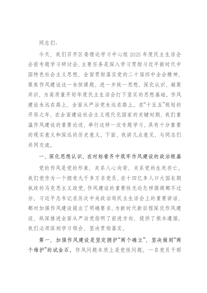 同志们:今天,我们召开区委理论学习中心组2025年度民主生活会会前专题学习研讨会,主要任务是深入学习贯彻习近平新时代中国特色社会主义思想,全面贯彻落实党的二十届四中全会精神,聚焦作风建设这一永恒课题,进一步统一思想、深化认识、凝聚共识,为高质量开好年度民主生活会打下坚实的思想基础。作风建设永远在路上,全面从严治党永远在路上。在“十五五”规划的开局之年,在全面建设社会主义现代化国家的关键时期,我们重温作风建设的重要论述,举行这样一次专题学习,具有十分重要的现实意义和深远的历史意义。下面,我讲几点意见,与同志们共同交流。一、深化思想认识,在对标看齐中筑牢作风建设的政治根基党的作风是党的形象,关系人心向背,关系党的生死存亡。我们党作为一个拥有九千多万名党员、在十四亿多人口大国长期执政的马克思主义政党,作风建设的重要性无论怎样强调都不过分。习近平总书记在历次中央政治局民主生活会上的重要讲话,都对加强作风建设提出了明确要求,为新时代新征程深化作风建设、纵深推进全面从严治党指明了前进方向,提供了根本遵循。我们必须深刻学习领会,坚决贯彻落实。第一,加强作风建设是坚定拥护“两个确立”、坚决做到“两个维护”的试金石。作风问题本质上是党性问题。一名党员干部的作风好不好,直接反映其党性强不强、政治站位高不高。我们要深刻认识到,加强作风建设,首要的是政治上的看齐。全区各级领导干部要始终把讲政治摆在首位,不断提高政治判断力、政治领悟力、政治执行力,以实际行动诠释对党忠诚。要将学习贯彻习近平新时代中国特色社会主义思想作为终身必修课,做到学思用贯通、知信行统一,真正把“两个确立”的政治共识转化为“两个维护”的实际行动,确保党中央的各项决策部署在*区不折不扣地落地生根、开花结果。衡量我们工作成效的根本标准,就是看我们是否坚决执行了中央的指示,是否让人民群众满意,任何偏离这个航向的“小聪明”和“土政策”,都是作风不正、党性不纯的体现。第二,加强作风建设是应对风险挑战、推动事业发展的硬保障。当前,世界百年未有之大变局加速演进,我国发展进入战略机遇和风险挑战并存、不确定难预料因素增多的时期。于我们*区而言,正处于转型升级、爬坡过坎的关键阶段,既面临着前所未有的发展机遇,也面对着诸多严峻复杂的挑战。经济结构调整的阵痛、民生领域的短板、社会治理的难题,无一不是对我们执政能力和工作作风的重大考验。唯有以过硬的作风,才能战胜前进道路上的一切艰难险阻。我们要清醒地看到,躺在过去的功劳簿上“睡大觉”、面对矛盾问题“绕道走”、落实工作任务“打折扣”等不良风气,是阻碍我们事业发展的最大敌人。我们必须以打好