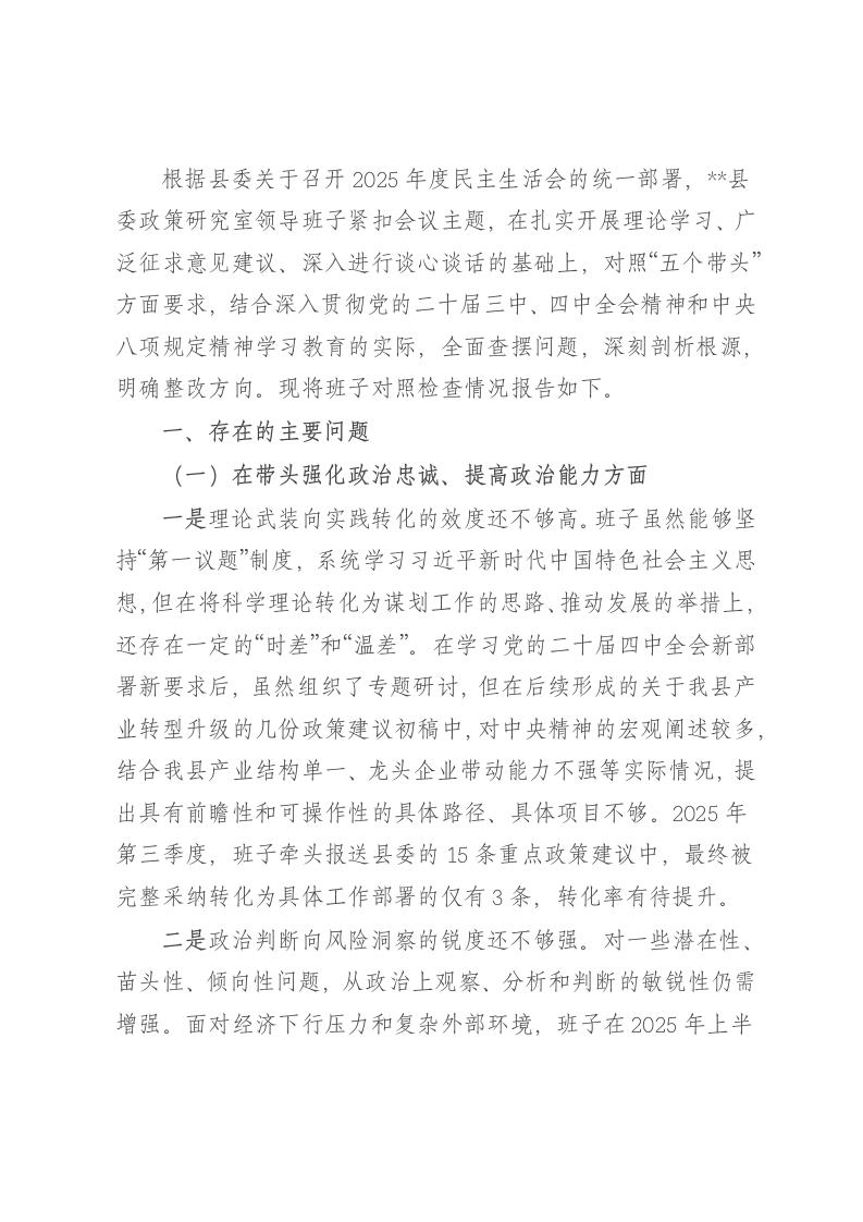 根据县委关于召开2025年度民主生活会的统一部署,*县委政策研究室领导班子紧扣会议主题,在扎实开展理论学习、广泛征求意见建议、深入进行谈心谈话的基础上,对照“五个带头”方面要求,结合深入贯彻党的二十届三中、四中全会精神和中央八项规定精神学习教育的实际,全面查摆问题,深刻剖析根源,明确整改方向。现将班子对照检查情况报告如下。一、存在的主要问题(一)在带头强化政治忠诚、提高政治能力方面一是理论武装向实践转化的效度还不够高。班子虽然能够坚持“第一议题”制度,系统学习习近平新时代中国特色社会主义思想,但在将科学理论转化为谋划工作的思路、推动发展的举措上,还存在一定的“时差”和“温差”。在学习党的二十届四中全会新部署新要求后,虽然组织了专题研讨,但在后续形成的关于我县产业转型升级的几份政策建议初稿中,对中央精神的宏观阐述较多,结合我县产业结构单一、龙头企业带动能力不强等实际情况,提出具有前瞻性和可操作性的具体路径、具体项目不够。2025年第三季度,班子牵头报送县委的15条重点政策建议中,最终被完整采纳转化为具体工作部署的仅有3条,转化率有待提升。二是政治判断向风险洞察的锐度还不够强。对一些潜在性、苗头性、倾向性问题,从政治上观察、分析和判断的敏锐性仍需增强。面对经济下行压力和复杂外部环境,班子在2025年上半年分析全县经济形势时,过多地从经济数据、产业指标等技术层面进行解读,对于数据背后可能隐藏的产业链安全风险、重点领域“卡脖子技术瓶颈等政治安全问题,未能进行足够深入的研判。导致提交的《关于当前经济运行的几点思考》报告中,风险预警和应对预案的部分着墨不多,在县委常委会上被指出“忧患意识体现得还不够充分”。三是决策执行向基层穿透的力度还不够足。在推动县委重大决策部署的贯彻落实中,满足于发文、开会、部署任务,但在“最后一公里”的跟踪问效、督促进度上还存在薄弱环节。例如,县委部署的“数字乡村”治理体系建设工作,政研室承担了相关的调研督导职责。但在2025年10月形成的季度进展报告中,主要依据的是各乡镇报送的书面材料和数据,班子成员未能带队深入到村组一线,实地了解智慧党建、线上治理平台在基层干部群众中的实际使用率和遇到的操作难题,导致报告呈现的“一片向好”与部分基层干部反映的“操作繁、推广难”存在一定差距,影响了县委对策的精准性。(二)在带头固本培元、增强党性方面一是理想信念的“压舱石”作用发挥不充分。在面对急难险重的研究任务时,班子成员有时会不自觉地产生“重业务、轻政治”的倾向,把完成任务作为首要目标,而对标对表党性要求、用理想信念砥砺攻坚意志的自觉性有所弱化。在2025年初牵头开展