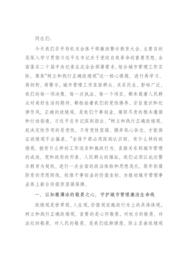 同志们:今天我们召开局机关全体干部廉政警示教育大会,主要目的是深入学习贯彻习近平总书记关于党的自我革命的重要思想,全面落实二十届中央纪委五次全会部署要求,结合城市管理工作实际,聚焦“树立和践行正确政绩观”这一核心课题,进行再学习、再剖析、再警示。城市管理工作直面群众、关系民生、影响广泛,我们的每一项决策、每一次执法、每一个项目,都承载着人民群众对美好生活的期待,都检验着我们的党性修养、宗旨意识和纪律作风。正确的政绩观,是我们干事创业、履职尽责的根本遵循和行动指南。习近平总书记深刻指出,“树立和践行正确政绩观,起决定性作用的是党性。只有党性坚强、摒弃私心杂念,才能保证政绩观不出偏差。”全体干部必须深刻认识到,有什么样的政绩观,就有什么样的工作追求和施政行为,直接关系到城市管理的成效、党和政府的形象、人民群众的福祉。我们必须以此次警示教育为契机,进行一次全面的政治体检和思想洗礼,筑牢拒腐防变的思想防线,校准干事创业的价值坐标,为推动城市管理事业再上新台阶提供坚强保障。一、以如履薄冰的敬畏之心,守护城市管理廉洁生命线政绩观是世界观、人生观、价值观在施政行为上的具体体现。树立和践行正确政绩观,首要的是心怀敬畏。对权力的敬畏、对法纪的敬畏、对人民的敬畏,是我们抵御诱惑、防止歪曲政绩观的“压舱石”。城市管理领域涉及行政审批、行政执法、项目建设、资金使用等诸多环节,廉政风险点集中、社会关注度高。一旦政绩观出现偏差,就可能将手中权力异化为谋取私利、追求虚假政绩的工具,最终损害公共利益、败坏队伍形象、侵蚀党的执政根基。我们必须时刻保持清醒头脑,深刻认识反腐败斗争形势的严峻性复杂性,深刻理解“全面从严治党永远在路上,党的自我革命永远在路上”的重大判断,将敬畏之心内化于心、外化于行。(一)深刻认识权力特质,筑牢慎权畏纪思想防线权力是一把“双刃剑”,用之于公可造福百姓,用之于私则贻害无穷。城市管理干部手中的权力,无论是项目审批权、行政处罚权,还是管理监督权,都来自于人民,必须用于服务人民。树立正确政绩观,首先要解决“权力是谁赋予、为谁行使”的根本问题。习近平总书记强调,“要守住权力关,始终保持对权力的敬畏感,坚持公正用权、依法用权、为民用权、廉洁用权。”这要求我们必须摆正权力观,清醒认识到权力是责任、是担当,而不是个人炫耀的资本、寻租的工具。要坚决摒弃“官本位”思想,破除特权思维和霸道作风,在任何时候都不能槁权力变现、利益输送。要不断加强党性锻炼和道德修养,从思想深处拧紧“总开关”常修为政之德,常思贪欲之害,常怀律己之心。要将纪律规矩刻印在心,深入学习党章党规党纪和国家法律法规,特别是与城市管理工作密切相关的《中华人民共和国行政处罚法》、《中华人