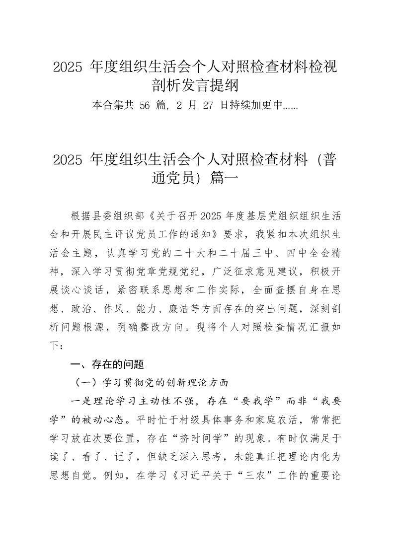 2025年度组织生活会个人对照检查材料检视剖析发言提纲本合集共56篇,2月27日持续加更中…2025年度组织生活会个人对照检查材料(普通党员)篇一根据县委组织部《关于召开2025年度基层党组织组织生活会和开展民主评议党员工作的通知》要求,我紧扣本次组织生活会主题,认真学习党的二十大和二十届三中、四中全会精神,深入学习贯彻党章党规党纪,广泛征求意见建议,积极开展谈心谈话,紧密联系思想和工作实际,全面查摆自身在思想、政治、作风、能力、廉洁等方面存在的突出问题,深刻剖析问题根源,明确整改方向。现将个人对照检查情况汇报如下:一、存在的问题(一)学习贯彻党的创新理论方面一是理论学习主动性不强,存在“要我学”而非“我要学”的被动心态。平时忙于村级具体事务和家庭农活,常常把学习放在次要位置,存在“挤时间学”的现象。有时仅满足于读了、看了、记了,但缺乏深入思考,未能真正把理论内化为思想自觉。例如,在学习《习近平关于“三农”工作的重要论述》时,虽然通读了原文,但对于如何将其中关于乡村治理、产业振兴的理念转化为推动本村发展的具体办法,思考不深、研究不够,导致理论学习与实际工作“两张皮”。二是学习方式较为单一,缺乏系统性和深度。主要依赖支部集中学习和手机推送内容,很少主动研读原著原文,对党的创新理论的历史脉络、核心要义、实践要求理解不够全面。比如在理解“中国式现代化”的内涵时,仅停留在宏观层面的认知,对其在乡村振兴中的具体体现和实现路径缺乏深入把握,导致在向群众宣传政策时讲不透、说不清,影响了政策的落地效果。三是学用结合不够紧密,理论指导实践能力偏弱。在工作中遇到复杂问题时,不能自觉运用党的立场观点方法去分析解决。如在处理村民宅基地纠纷时,更多依赖传统经验调解,未能从“坚持和发展新时代‘枫桥经验’”的高度来统筹考虑,缺乏法治思维和系统观念,工作成效打了折扣。(二)加强党性锻炼方面一是政治敏锐性有待提升。对社会上一些错误思潮和网络谣言缺乏足够的警惕性,有时听到群众议论个别负面言论,未能第一时间站出来澄清驳斥,存在“多一事不如少一事”的想法。比如去年村里有村民转发“基层干部吃空饷”等不实信息,我虽知其虚假,但仅私下劝阻,未在党员会上主动发声引导,错失了教育引导群众的良机。