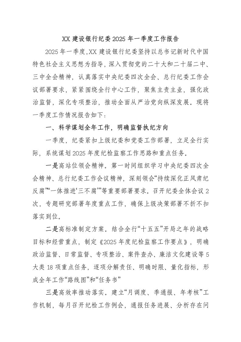 X建设银行纪委2025年一季度工作报告2025年一季度,XX建设银行纪委坚持以总书记新时代中国特色社会主义思想为指导,深入贯彻党的二十大和二十届二中、三中全会精神,认真落实中央纪委四次全会、总行纪委工作会议部署要求,紧紧围绕全行中心工作,聚焦主责主业,强化政治监督,深化专项整治,推动全面从严治党向纵深发展。现将一季度工作情况报告如下:一、科学谋划全年工作,明确监督执纪方向一季度,纪委紧扣上级纪委和党委工作部署,立足全行实际,系统谋划2025年度纪检监察工作思路和重点任务。一是高站位领会精神。第一时间组织学习中央纪委四次全会精神、总行纪委工作会议精神,深刻领会“持续深化正风肃纪反腐“一体推进‘三不腐”等重要部署要求。召开纪委全体会议2次,专题研究部署年度重点工作,确保上级决策部署不折不扣落实到位。二是高标准制定方案。结合全行“十五五”开局之年的战略目标和经营重点,制定《2025年度纪检监察工作要点》,明确政治监督、日常监督、专项整治、案件查办、廉洁文化建设等5大类18项重点任务,逐项分解责任、明确时限、量化指标,形成全年工作“路线图”和“任务书”三是高效率推动落实。建立“月调度、季通报、年考核”工作机制,每月召开纪检工作例会,通报任务进展、分析存在问题、研究推进措施。一季度共召开工作例会3次,调度重点任务12项,督办整改事项8项,确保各项工作有序推进。二、打造“一行一品”特色,培育廉洁文化品牌一季度,纪委围绕“以文化人、以廉润心”工作理念,大力推进“一行一品”廉洁文化品牌建设,各支行结合自身特点打造特色廉洁文化阵地。一是科学规划布局。制定《“一行一品”廉洁文化品牌创建实施方案》,按照“一支行一特色、一品牌一亮点”思路,指导X个支行结合地域文化、网点特色、业务重点,分别确定廉洁文化创建主题。如城区支行打造“清风建行”品牌,突出“清廉服务、清正营销”理念;郊县支行打造“廉润乡村”品牌,将廉洁文化融入支农支小服务。二是丰富载体形式。各支行创新廉洁文化传播方式,建设廉洁文化墙8面、廉洁书角12个,制作廉洁提示牌、桌签等物品200余件。开展“廉洁家书”征集活动,收到员工及家属来稿68篇,评选优秀作品12篇在全行展播。举办“清风伴我行”主题演讲比赛,X名员工参赛,3人获奖并推荐参加上级比赛。三是注重实效转化。将廉洁文化建设与业务经营深度融合,在营业网点设置“廉洁服务承诺”公示牌,向客户公开服务标准和监督电话。开展“廉洁建行·诚信服务”客户满意度调查,收集有效问卷X份,客户满意度达98.6%。一季度全行未发生员工违规收费、服务态度投诉等问题,“一行一品”品牌效应初步显