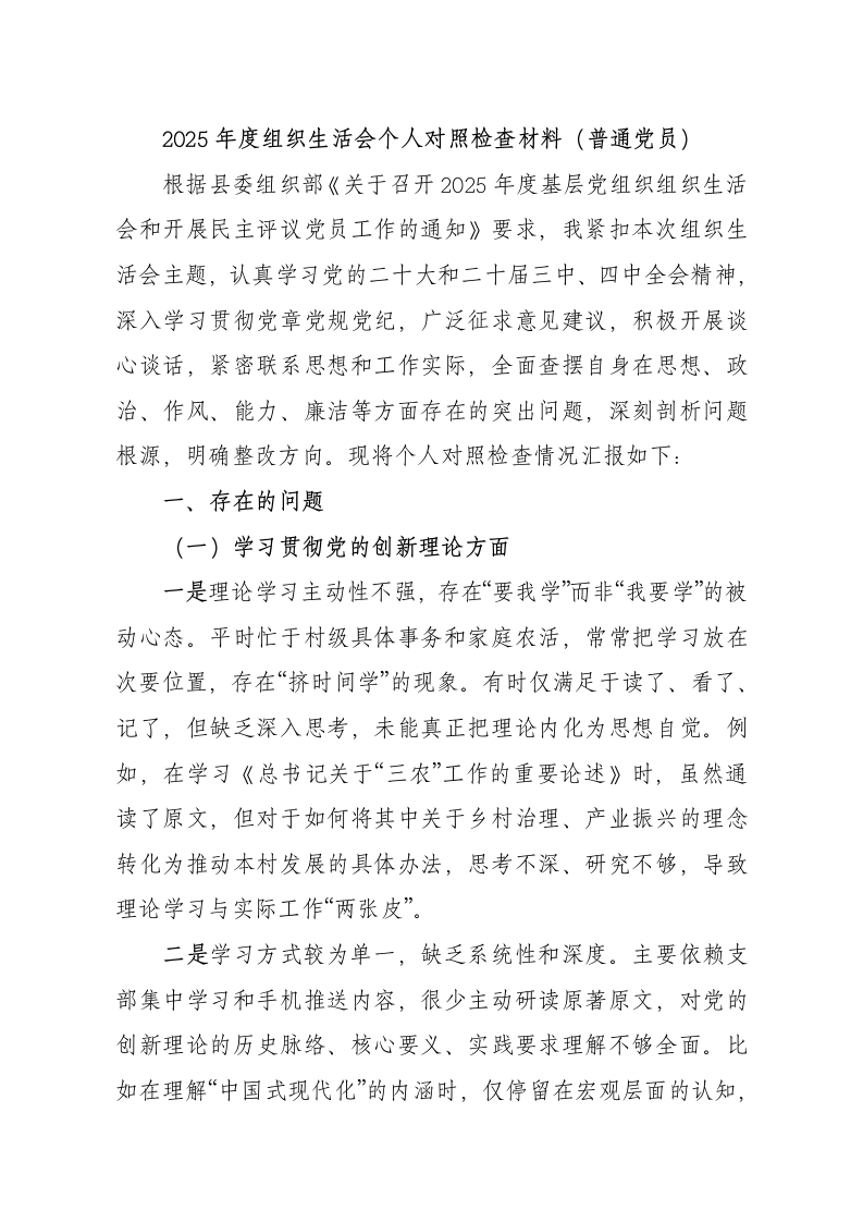 2025年度组织生活会个人对照检查材料(普通党员)根据县委组织部《关于召开2025年度基层党组织组织生活会和开展民主评议党员工作的通知》要求,我紧扣本次组织生活会主题,认真学习党的二十大和二十届三中、四中全会精神,深入学习贯彻党章党规党纪,广泛征求意见建议,积极开展谈心谈话,紧密联系思想和工作实际,全面查摆自身在思想、政治、作风、能力、廉洁等方面存在的突出问题,深刻剖析问题根源,明确整改方向。现将个人对照检查情况汇报如下:一、存在的问题(一)学习贯彻党的创新理论方面一是理论学习主动性不强,存在“要我学”而非“我要学”的被动心态。平时忙于村级具体事务和家庭农活,常常把学习放在次要位置,存在“挤时间学”的现象。有时仅满足于读了、看了、记了,但缺乏深入思考,未能真正把理论内化为思想自觉。例如,在学习《总书记关于“三农”工作的重要论述》时,虽然通读了原文,但对于如何将其中关于乡村治理、产业振兴的理念转化为推动本村发展的具体办法,思考不深、研究不够,导致理论学习与实际工作“两张皮”。二是学习方式较为单一,缺乏系统性和深度。主要依赖支部集中学习和手机推送内容,很少主动研读原著原文,对党的创新理论的历史脉络、核心要义、实践要求理解不够全面。比如在理解“中国式现代化”的内涵时,仅停留在宏观层面的认知,对其在乡村振兴中的具体体现和实现路径缺乏深入把握,导致在向群众宣传政策时讲不透、说不清,影响了政策的落地效果。三是学用结合不够紧密,理论指导实践能力偏弱。在工作中遇到复杂问题时,不能自觉运用党的立场观点方法去分析解决。如在处理村民宅基地纠纷时,更多依赖传统经验调解,未能从“坚持和发展新时代‘枫桥经验”的高度来统筹考虑,缺乏法治思维和系统观念,工作成效打了折扣。(二)加强党性锻炼方面一是政治敏锐性有待提升。对社会上一些错误思潮和网络谣言缺乏足够的警惕性,有时听到群众议论个别负面言论,未能第一时间站出来澄清驳斥,存在“多一事不如少一事”的想法。比如去年村里有村民转发“基层干部吃空饷”等不实信息,我虽知其虚假,但仅私下劝阻,未在党员会上主动发声引导,错失了教育引导群众的良机。二是组织纪律有所松懈。虽然能按时交纳党费、参加组织生活,但有时因农忙或家庭事务请假缺席,未能做到“无特殊情况绝不缺席”。在参加组织生活时,发言积极性不高,多以听为主,很少主动交流心得体会,存在“走过场”倾向。在开展批评与自我批评时,自我批评避重就轻,对他人的批评也多以“建议”代“批评”,辣味不足,未能真正达到“红脸出汗”的效果。三是宗旨意识有所淡化。随着年龄增长和长期在农村生活,我产生了“守成”心态,干事创业的热情有所减退。面对村级发