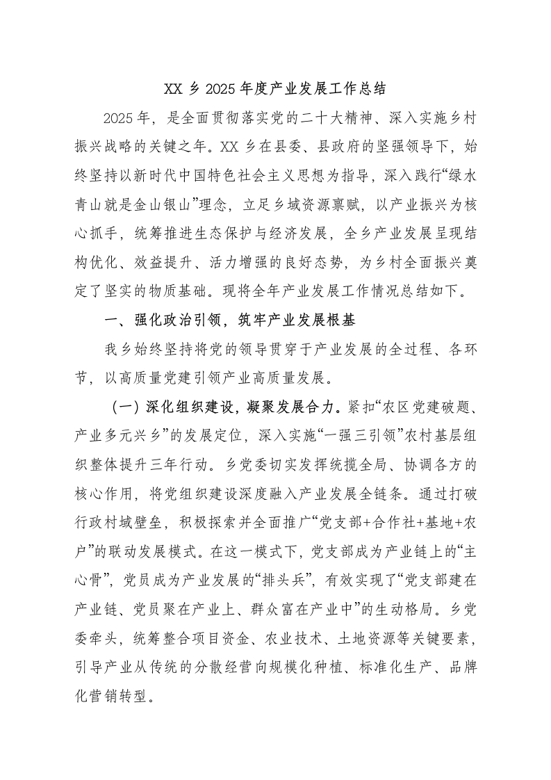 X乡2025年度产业发展工作总结2025年,是全面贯彻落实党的二十大精神、深入实施乡村振兴战略的关键之年。X乡在县委、县政府的坚强领导下,始终坚持以新时代中国特色社会主义思想为指导,深入践行“绿水青山就是金山银山”理念,立足乡域资源禀赋,以产业振兴为核心抓手,统筹推进生态保护与经济发展,全乡产业发展呈现结构优化、效益提升、活力增强的良好态势,为乡村全面振兴奠定了坚实的物质基础。现将全年产业发展工作情况总结如下。一、强化政治引领,筑牢产业发展根基我乡始终坚持将党的领导贯穿于产业发展的全过程、各环节,以高质量党建引领产业高质量发展。(一)深化组织建设,凝聚发展合力。紧扣“农区党建破题、产业多元兴乡”的发展定位,深入实施“一强三引领”农村基层组织整体提升三年行动。乡党委切实发挥统揽全局、协调各方的核心作用,将党组织建设深度融入产业发展全链条。通过打破行政村域壁垒,积极探索并全面推广“党支部+合作社+基地+农户”的联动发展模式。在这一模式下,党支部成为产业链上的“主心骨”,党员成为产业发展的“排头兵”,有效实现了“党支部建在产业链、党员聚在产业上、群众富在产业中”的生动格局。乡党委牵头,统筹整合项目资金、农业技术、土地资源等关键要素,引导产业从传统的分散经营向规模化种植、标准化生产、品牌化营销转型。(二)创新联结机制,共享发展红利。为有效激活农村资源要素,保障农民切身利益,我乡创新构建了“土地流转得租金、务工就业得薪金、入股合作得分红”的多元复合型增收机制。该机制将农户紧密嵌入产业化链条,形成了“风险共担、利益共享”的产业发展共同体。2025年,通过该机制带动全乡超过一千户农户实现稳定增收。例如,XX村蔬菜种植基地不仅有效盘活了土地资源,还为周边村民提供了70余个长期或季节性就业岗位,年度累计发放务工工资66万余元,同时为村集体经济贡献收入7.82万元,实现了群众增收与集体经济发展的双赢。二、优化全域布局,绘就产业振兴新图景我乡坚持规划先行、因地制宜、分区施策,科学布局全域产业,推动形成各具特色、优势互补、协同发展的产业空间格局。(一)实施分类指导,推动错位发展。立足不同区域的资源条件和产业基础,实施差异化发展策略。在XX江沿岸区域,以大力整治撂荒地为突破口,集中打造连片油菜种植基地,形成的千亩油菜花海不仅成为靓丽的生态景观,更通过菜籽油加工和乡村旅游带动,转化为富民的“黄金产业”。X村依托传统的家庭养殖基础,大力推广“合作社+养殖户”模式,推动林下养鸡产业走向规模化、标准化,实现了生态养殖与林木管护的良性循环。X村聚焦道地中药材种植,集中发展桔梗等品种,建成规模化基地500余亩,预计亩均收入可达6000元,显著拓宽
