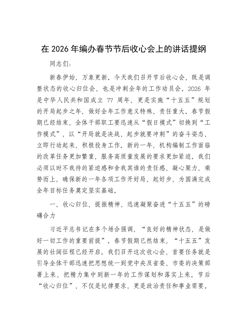 在2026年编办春节节后收心会上的讲话提纲同志们:新春伊始,万象更新。今天我们召开节后收心会,既是调整状态的收心归位会,也是冲刺全年的工作动员会。2026年是中华人民共和国成立77周年,更是实施“十五五”规划的开局起步之年,做好全年工作意义特殊、责任重大。春节假期已经结束,全体干部职工要迅速从“假日模式”切换到“工作模式”,以“开局就是决战、起步就要冲刺”的奋斗姿态,立即行动起来,积极投身工作。新的一年,机构编制工作面临的改革任务更加繁重,服务高质量发展的要求更加紧迫。我们必须以时不我待的紧迫感和舍我其谁的责任感,凝心聚力、乘势而上,确保新的一年各项工作开好局、起好步,为圆满完成全年目标任务奠定坚实基础。一、收心归位,提振精神,迅速凝聚奋进“十五五”的磅礴合力习近平总书记在多个场合强调,“良好的精神状态,是做好一切工作的重要前提”。春节假期已然结束,“十五五”发展的壮阔征程已经开启。我们召开这次收心会,首要任务就是引导全体干部迅速把思想统一到党中央及省委、市委的决策部署上来,把精力集中到新一年的工作谋划和落实上来。节后“收心归位”,不仅是纪律要求,更是政治责任和事业需要。全办上下必须深刻认识到,机构编制资源是重要政治资源、执政资源,我们的工作成效直接关系国家治理体系和治理能力现代化。面对新阶段、新任务,容不得丝毫懈怠,必须立即从“过年状态”转为“战斗状态”,以饱满的热情、务实的作风、昂扬的斗志,全身心投入到新一年的工作中,为“十五五”时期机构编制工作高质量发展凝聚起心往一处想、劲往一处使的强大合力。(一)深化思想认识,在提高政治站位中把稳方向之舵新的一年,各项工作千头万绪,但首要的是统一思想、提高认识。我们必须深刻把握机构编制工作的政治属性,始终将其置于党和国家事业发展全局中来审视和推进。一是要持续强化理论武装,筑牢政治忠诚。要坚持把学习贯彻习近平新时代中国特色社会主义思想作为首要政治任务,特别是要深学细悟习近平总书记关于机构编制工作的重要论述和重要指示批示精神。要健全以学铸魂、以学增智、以学正风、以学促干的长效机制,引导全体干部自觉在思想上政治上行动上同党中央保持高度一致,不断提高政治判断力、政治领悟力、政治执行力。要自觉将机构编制工作放到服务全市中心大局中去思考、谋划和推进,确保市委和市委编委的各项决策部署在编办系统不折不扣落地生根。要将对党忠诚体现在坚决贯彻党中央关于深化机构改革、优化编制资源配置等一系列重大战略部署的实际行动上,确保机构编制工作始终沿着正确政治方向前进。二是要