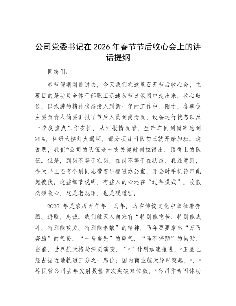 公司党委书记在2026年春节节后收心会上的讲话提纲同志们:春节假期刚刚过去,今天我们在这里召开节后收心会,主要目的是动员全体干部职工迅速从节日氛围中走出来,收心归位,以饱满的精神状态投入到新一年的工作中。刚才,各单位主要负责人简要汇报了节后人员到岗情况、设备运行状态以及一季度重点工作安排。从汇报情况看,生产车间到岗率达到98%,科研大楼灯火通明,部分项目团队初三就开始加班。这说明,我们*公司的队伍是一支关键时刻拉得出、顶得上的队伍。但是,到岗不等于在岗,在岗不等于在状态。我注意到,今天早上还有个别同志带着早餐进办公室,开会时手机铃声此起彼伏。这些细节说明,有些人的心还在“过年模式”。收假必须收心,这是老规矩,也是硬道理。2026年是农历丙午年,马年。马在传统文化中象征着奔腾、进取、忠诚。我们航天人向来有“特别能吃苦、特别能战斗、特别能攻关、特别能奉献”的精神,马年更要拿出“万马奔腾”的气势、“一马当先”的勇气、“马不停蹄”的韧劲。当前,世界航天格局深刻演变,“*”计划加速推进,*卫星已经占据近地轨道三分之一席位;国内商业航天异军突起,*、*等民营公司去年发射数量首次突破双位数。*公司作为固体动力国家队,不进则退,慢进也是退。今年我们承担的型号任务是去年的1.3倍,交付周期却压缩了20%。形势逼人,任务催人,我们必须立刻进入战斗姿态。一、收心归位,从“假期模式”切换到“战斗姿态”一是思想上“紧”起来,迅速归位。思想是行动的先导。春节长假,大家走亲访友、休闲娱乐,身心得到放松,这是必要的。但节后上班,就要像战士听到冲锋号,像运动员听到发令枪,第一时间进入状态。有的同志觉得,节后前两天是“过渡期”,可以慢慢调整。这种想法要不得。2026年的任务日历已经翻开,一季度只剩下不到50个工作日,而我们要完成全年25%的交付量。按这个节奏,如果节后还缓三天,三月就得连轴转;如果三月还赶不出来,上半年目标就要落空。去年*分厂,就是因为节后收心不力,导致*型号壳体生产滞后一周,后续工序全员无休赶工,虽然最终交付了,但质量隐患埋下了,成本超支了。这个教训必须记取。今年,从今天开始,每个人都要问自己三个问题:我的岗位职责是什么?今天的任务是什么?本周的节点是什么?思想拉满弓,行动才能拉满弦。昨天*新闻联播报道,*改遥一火箭正在总装测试,预计下月首飞,我们配套的上面级发动机已经交付。这发箭能不能飞成功,就看我们发动机在箭上表现好不好。思想不绷紧,螺丝拧不紧,上天就要出大事。