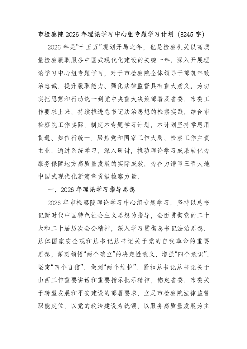 市检察院2026年理论学习中心组专题学习计划(8245字)2026年是“十五五”规划开局之年,也是检察机关以高质量检察履职服务中国式现代化建设的关键一年。深入开展理论学习中心组专题学习,对于市检察院全体领导干部筑牢政治忠诚、提升履职能力、强化法律监督具有重大意义。为切实把思想和行动统一到党中央重大决策部署及省委、市委工作要求上来,持续推进总书记法治思想的检察实践,结合市检察院工作实际,制定本专题学习计划。本计划坚持学思用贯通、知信行统一,聚焦党和国家工作大局、检察工作主责主业,通过系统学习、深入研讨,推动理论学习成果转化为服务保障地方高质量发展的实际成效,为奋力谱写三晋大地中国式现代化新篇章贡献检察力量。一、2026年理论学习指导思想2026年市检察院理论学习中心组专题学习,坚持以总书记新时代中国特色社会主义思想为指导,全面贯彻党的二十大和二十届历次全会精神,深入学习贯彻总书记法治思想、总体国家安全观和总书记总书记关于党的自我革命的重要思想,深刻领悟“两个确立”的决定性意义,增强“四个意识”、坚定“四个自信”、做到“两个维护”。紧扣总书记总书记关于山西工作重要讲话和重要指示批示精神,锚定省委、市委关于转型发展和平安建设的部署要求,立足市检察院法律监督职能定位,以党的政治建设为统领,以服务高质量发展为主题,以提升检察履职质效为核心,坚持学深悟透党的创新理论,坚持联系实际、学以致用,不断提高领导干部政治判断力、政治领悟力、政治执行力,切实把学习成果转化为依法能动履职、强化法律监督、深化司法改革、锻造过硬队伍的具体行动,为维护社会公平正义、保障地方经济社会发展、推进更高水平平安x、法治x建设提供坚强思想保证和理论支撑。二、专题学习内容1.深学笃行总书记新时代中国特色社会主义思想,筑牢检察履职政治根基深入学习《总书记著作选读》第一卷、第二卷,深刻把握总书记新时代中国特色社会主义思想的世界观、方法论和贯穿其中的立场观点方法,切实把这一重要思想作为检察工作的根本遵循和行动指南。认真研读《总书记谈治国理政》第四卷中“坚持党的全面领导”“坚持人民至上”等专题内容,深刻理解其核心要义、精神实质、丰富内涵和实践要求,不断增进理论认同、思想认同、情感认同。结合检察工作实际,重点领会这一重要思想对政法工作、检察工作提出的政治要求,始终坚持党对检察工作的绝对领导,把党的领导贯穿检察履职全过程、各环节。强化理论武装是筑牢政治忠诚的前提,必须把学习贯彻总书记新时代中国特色社会主义思想与检察工作实际紧密结合,将理论滋养转化为履职动能。要通