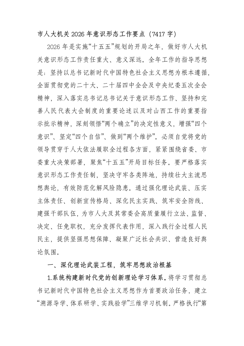市人大机关2026年意识形态工作要点(7417字)2026年是实施“十五五”规划的开局之年,做好市人大机关意识形态工作责任重大、意义深远。全年工作的指导思想是:坚持以总书记新时代中国特色社会主义思想为根本遵循,全面贯彻党的二十大、二十届四中全会及中央纪委五次全会精神,深入落实总书记总书记关于意识形态工作、坚持和完善人民代表大会制度的重要论述以及对山西工作的重要指示批示精神,深刻领悟“两个确立”的决定性意义,增强“四个意识”、坚定“四个自信”、做到“两个维护”。必须自觉将党的领导贯穿于人大依法履职全过程各方面,紧紧围绕省委、市委重大决策部署,聚焦“十五五”开局目标任务。要严格落实意识形态工作责任制,坚决守牢各类阵地,持续壮大主流思想舆论,有效防范化解风险隐患。通过强化理论武装、压实主体责任、创新宣传格局、深化民主实践、筑牢安全防线、建强干部队伍,为市人大及其常委会高质量履行立法、监督、决定、任免职权,充分发挥代表作用,深入践行全过程人民民主,提供坚强思想保障、凝聚广泛社会共识、营造良好舆论氛围。一、深化理论武装工程,筑牢思想政治根基1.系统构建新时代党的创新理论学习体系。将学习贯彻总书记新时代中国特色社会主义思想作为首要政治任务,建立“溯源导学、体系研学、实践验学”三维学习机制。严格执行“第一议题”制度,第一时间组织学习总书记总书记最新重要讲话、重要文章和指示批示精神,特别是关于本领域本部门工作的重要论述。制定并实施《市人大机关2026年度理论学习中心组学习计划》,将《总书记谈治国理政》第一至五卷作为核心教材,按专题分章节开展系统性研学,每季度至少组织一次集中研讨交流,推动读原著、学原文、悟原理走向深入。将总书记总书记关于坚持和完善人民代表大会制度的重要思想、发展全过程人民民主的重大理念作为学习重点,设立“人大制度理论与实践”研究专题,组织机关干部结合立法、监督案例开展对比性、实证性研究,撰写理论文章或调研报告,切实将学习成果转化为对人大工作规律的科学认识和推动工作的务实思路。2.创新打造“全过程人民民主”沉浸式思政课堂。借鉴“大思政课”理念,依托人大代表联络站、基层立法联系点等实体阵地,建设具有人大特色的“全过程人民民主实践教学基地”。研发“制度之源民主之旅”主题教学线路,通过组织机关干部、人大代表、青少年学生等群体参观宪法宣誓区、代表履职长廊、立法协商展厅,观摩模拟审议、预算听证、代表建议督办等场景,将抽象的制度理论与具体的民主实践相结合。联合市委党校、高校马克思主义学院,开发“人民代表大会制度优越性”“立法中的民意聚合“监督权的行使与实效”等系列精品课程与案例教案。年内举办不少于4期“开放日”或“实践课”