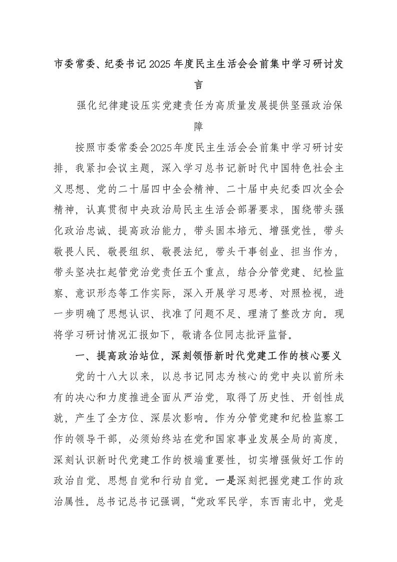 市委常委、纪委书记2025年度民主生活会会前集中学习研讨发言强化纪律建设压实党建责任为高质量发展提供坚强政治保障按照市委常委会2025年度民主生活会会前集中学习研讨安排,我紧扣会议主题,深入学习总书记新时代中国特色社会主义思想、党的二十届四中全会精神、二十届中央纪委四次全会精神,认真贯彻中央政治局民主生活会部署要求,围绕带头强化政治忠诚、提高政治能力,带头固本培元、增强党性,带头敬畏人民、敬畏组织、敬畏法纪,带头干事创业、担当作为,带头坚决扛起管党治党责任五个重点,结合分管党建、纪检监察、意识形态等工作实际,深入开展学习思考、对照检视,进一步明确了思想认识、找准了问题不足、理清了整改方向。现将学习研讨情况汇报如下,敬请各位同志批评监督。一、提高政治站位,深刻领悟新时代党建工作的核心要义党的十八大以来,以总书记同志为核心的党中央以前所未有的决心和力度推进全面从严治党,取得了历史性、开创性成就,产生了全方位、深层次影响。作为分管党建和纪检监察工作的领导干部,必须始终站在党和国家事业发展全局的高度,深刻认识新时代党建工作的极端重要性,切实增强做好工作的政治自觉、思想自觉和行动自觉。一是深刻把握党建工作的政治属性。总书记总书记强调,“党政军民学,东西南北中,党是领导一切的”。党的建设的首要任务是保证全党服从中央,坚持党中央权威和集中统一领导。通过系统学习,我更加深刻地认识到,党的建设本质上是政治建设,必须把旗帜鲜明讲政治贯穿始终。要深刻领悟“两个确立”的决定性意义,增强“四个意识”坚定“四个自信”、做到“两个维护”,不断完善坚定维护党中央权威和集中统一领导的各项制度,确保全党在政治立场、政治方向、政治原则、政治道路上同党中央保持高度一致。要始终把党的政治纪律和政治规矩挺在前面,坚决防止和纠正一切偏离“两个维护”的错误言行,坚决防止搞“小圈子”、“拜码头”、“搭天线”,有力打击各种政治骗子,严格防止把商品交换原则带到党内。二是深刻把握全面从严治党的战略方针。全面从严治党是新时代党的建设的鲜明主题,是党永葆生机活力、走好新的赶考之路的必由之路。总书记总书记在二十届中央纪委四次全会上强调,要加大风腐同查同治力度,将党风党纪硬要求变为硬举措、让铁规矩长出铁牙齿,向全党释放一严到底、寸步不让的信号。这一重要论述,为我们推进全面从严治党提供了根本遵循。当前,党风廉政建设和反腐败斗争形势依然严峻复杂,必须始终保持清醒头脑,坚持严的基调不动摇,把全面从严治党贯穿党的建设各方面和全过程。要巩固深化党纪学习教育成果,坚持融入日常、抓在经常,把党纪学习教育成果持续转化为推动高质量发展的强大动力,做到真管真严、敢管敢严、长