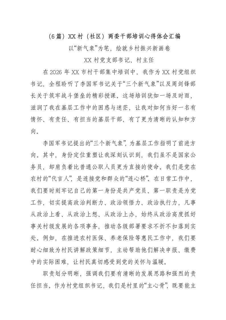 (6篇)X村(社区)两委干部培训心得体会汇编以“新气象”为笔,绘就乡村振兴新画卷XX村党支部书记、村主任在2026年X市村干部集中培训中,我作为X村党组织书记,全程聆听了李国军书记关于“三个新气象”以及周剑锋部长关于筑牢战斗堡垒的精彩授课。这场培训犹如一场及时雨,滋润了我在基层工作中的困惑与迷茫,让我对如何当好一名有情怀、有责任、有担当的基层干部,有了更为清晰的认知和方李国军书记提出的“三个新气象”为基层工作指明了前进方向。其中,身份定位重塑让我深刻认识到,我们虽不是国家公务员,却肩负着比普通公职人员更为直接的使命。我们是党在农村的“代言人”是连接党和群众的“连心桥”。在日常工作中,我们要时刻牢记自己的第一身份是共产党员、第一职责是为党工作,切实提高政治判断力、政治领悟力、政治执行力,凡事从政治上看、从政治上想、从政治上办,始终从政治高度抓好事关村级发展的各项事务,推动各级部署要求不折不扣落到实处。例如,在推进农村医保、养老保险等惠民工作中,我们要耐心细致为村民讲解政策细节,主动帮助他们解决申报、缴费中的实际困难,让村民真切感受到党的关怀与温暖。职责划分明晰,强调我们要有清晰的发展思路和强烈的责任担当。作为村党组织书记,我们是村里的“主心骨”既要能主