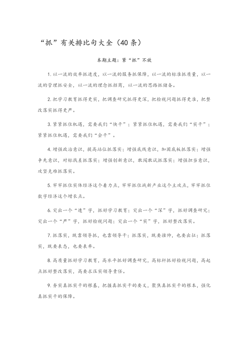 “抓”有关排比句大全(40条)本期主题:紧“抓”不放1.以一流的效率抓进度,以一流的服务抓保障,以一流的标准抓质量,以一流的管理抓安全,以一流的理念抓招商,以一流的思路抓储备。2.把学习教育抓得更实,把调查研究抓得更深,把检视问题抓得更准,把整改落实抓得更严。3.紧紧抓住机遇,需要我们“快千”;紧紧抓住机遇,需要我们“实千”;紧紧抓住机遇,需要我们“会千”。4.增强政治意识,提高站位抓落实;增强底线意识,加固底板抓落实;增强争先意识,对标找差抓落实:增强创新意识,敢闯敢试抓落实;增强担当意识,攻坚克难抓落实。5.牢牢抓住实体经济这个着力点,牢牢抓住战新产业这个主攻点,牢牢抓住数字经济这个增长点。6.突出一个“透”字,抓好学习教育:突出一个“深”字,抓好调查研究;突出一个“严”字,抓好检视问题:突出一个“实”字,抓好整改落实。7.抓落实,既靠领导抓,也靠领导干;抓落实,既要挂帅,也要出征:抓落实,既要表态,也要表率。8.高质量抓好学习教育,高水平抓好调查研究,高标杆抓好检视问题,高起点抓好整改落实,高要求压实领导责任。9.夯实真抓实千的根基,把握真抓实千的要义,聚焦真抓实千的根本,强化真抓实千的保障。10.抓班子带队伍,抓党建正风气,抓改革谋发展,抓稳定促和谐,抓执行保落实。11.既抓重要领域、重要任务、重要试点,又抓关键主体、关键环节、关键节点。12.突出“准”字抓学习领会,突出“实”字抓成果转化,突出“千”字抓担当作为。13.抓好党建工作是本职,抓不好党建工作是失职,不抓党建工作是不称职。14.抓紧理论武装不放松,抓实计划执行不含糊,抓牢责任落实不松劲。15.抓和不抓大不一样,真抓和假抓大不一样,严抓和松抓也大不一样。16.具体抓,才能接地气:具体抓,才能破真题:具体抓,才能明责任。17.把心思用到谋全局、抓大事上,把精力集中到抓落实、促发展上。18.千忙万忙,不抓落实就是瞎忙;千条万条,不抓落实就是白条。19.抓中心之工作,抓重点之困难,抓突出之问题,抓关键之方面。20.一手抓思想、塑形象、立标杆,一手抓警示、明底线、促敬畏。21.牵住了抓落实的“牛鼻子”,画出了抓落实的“施工图”。22.端正态度抓“常”,加大力度抓“实”,笃求精度抓“细”。23.着眼学懂抓深化,着眼弄通抓消化,着眼做实抓转化。24.以身作则抓落实,聚焦重点抓落实,形成合力抓落实。25.真抓的实劲,敢抓的狠劲,善抓的巧劲,常抓的韧劲。26.抓领导、领导抓,抓具体、具体抓,经常抓、抓经常。27.树立“真抓”的工作作风,学会“会抓”的本领方法。