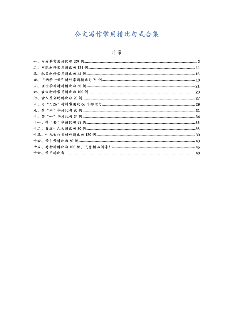 公文写作常用排比句式合集目录一、写材料常用排比句269例…2二、军队材抖常用排比句121例…三、机关材料常用排比句44例…四、“两学一做”材料常用排比句71例五、理论学习材料排比句50例….21六、官方材料常用排比句100例…七、古人原创的排比句20例…27八、写“7.26”材料常用的66个排比句29九、带“不”字排比句80例31十、带“一”字排比句34例…34十一、带“要”字排比句33例35十二、喜迎十九大排比句80例…36十三、十九大相关材料排比句120例…39十四、带引号排比句60例…十五、写材抖排比句100例,气势排山倒海!十六、常用排比句…一、写材料常用排比句269例1.停住脚读原著、静下心学原文、稳住神悟原理。2.带着信念学出绝对忠减,带着感情学出衷心拥戴,带着使命学出政治责任。3.自觉学党章,定期上党课,经常读党史,积极过党日,按时交党费,坚持讲党性,严格守党纪,始终跟党走。4.扑下身子、放下架子、甩开膀子、脱掉鞋子。5.千忙万忙,没有精准落实就是瞎忙:千招万招,没有精准落实就是虚招:千条万条,没有精准落实就是“白条”。6.坚持教育先行,坚持统筹推进,坚持层层动员,坚持分类指导,坚持常态督查。7.距离再远决不忘忠减,氧气再少决不缺精神,海拔再高决不厚使命,环境再苦决不破规矩。8.有位置坚决千好,换位置尽快适应,无位置坚决服从。9.骨头再难啃也不回避,敌人再强大也不畏惧,战争再难打也不退缩。10.工作标准一点不降、训练内容一项不少、安全工作一件不松、事故安全一个不出。11.指挥谋略胜敌一筹,战法运用强敌一招,临机决断先敌一步。12.思考问题在同一基点上、贯彻执行在同一直线上、思想意志在同一声调上。13.三五分钟不嫌短,三五句话不嫌少,三五个人不嫌散。14.见任务就上,见第一就争,见红旗就扛,见先进就学,见问题就改。15.铁一般的信仰刻在胸膛,铁一般的信念坚定方向,铁一般的纪律时刻不忘,铁一般的担当扛在肩上。16.不让老实肯千者吃亏,不让夸夸其谈者占先,不让投机钻营者得利。17.职务高不等于觉悟高,党龄长不等于党性强,年龄大不等于格局大。18.恋亲但不为亲徇私,念旧但不为旧谋利,济亲但不以公济私。19.克服坐而论道的“讲话秀”、议而不决的“问题秀”、走马观花的“调研秀”。20.心思不分散,精力不游移,千劲不松懈。21.阵痛之中保持坚忍,震荡之中保持定力,得失纠结之中保持豁达。22.抓一抓学一学,催一催动一动,考一考背一背。23.训练看情绪、工作看劲头、吃饭看胃口、睡觉看快慢、说话看态度。24.教育跟上,公开跟上,帮促跟上,活动跟上,防范跟上。25.不以位高而忘本,不以权重而忘形,不以名利而迷失自我。26.把家国大义扛在肩上,把百姓冷暖装在心中,把责任担当举过头顶。27.脑子里永远有任务,眼睛里永远有敌人,肩膀上永远有责任,胸膛里永远有激情。28.带着信仰学、学出信仰来,带着忠诚学、学出忠诚来,带着感情学、学出感情来,带着使命学、学出使命来。29.思想上坚定追随、政治上绝对忠诚、情感上真挚热爱、行动上紧紧跟上。30.不在困难面前低头,不在挑战面前退缩,不拿原则做交易,不在任何压力下吞下损害中华民族根本利益的苦果。31.适应新体制把准建设方向、履行新职能砥砺打赢本领、担当新使命时刻练兵备战。32.军人也有风花雪月,但那风是‘铁马秋风’、花是‘战地黄花’、雪是‘楼船夜雪’、月是‘边关冷月’。33.跑好“第一棒”、干好“第一任”、担好“第一责”,站好“第一哨”。
