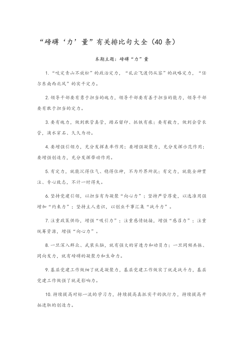 “磅礴‘力’量”有关排比句大全(40条)本期主题:磅礴“力”量1.“咬定青山不放松”的政治定力,“乱云飞渡仍从容”的战略定力,“任尔东南西北风”的实千定力。2.领导千部要有勇于担当的魄力,领导千部要有善于担当的能力,领导千部要有敢于担当的定力。3.要有魄力,做到敢管真管,踏石留印、抓铁有痕:要有毅力,做到会管长管,滴水穿石、久久为功。4.要增强引领力,充分发挥表率作用;要增强凝聚力,充分发挥示范作用:要增强创造力,充分发挥带动作用。5.有定力,就能沉得住气、稳得住神,不为外界所扰:有定力,就能全神贯注、专心致志,不计一时得失。6.坚持党建引领,以担当有为凝聚“向心力”;坚持严管厚爱,以选准用强增加“约束力”;坚持主人意识,以创业千事汇集“战斗力”。7.注重政策供给,增强“吸引力”:注重感情链接,增强“感召力”:注重统筹资源,增强“向心力”。8.一旦深入群众、武装头脑,就有强大的穿透力和动员力:一旦同频共振、同向发力,就有磅礴的凝聚力和生命力。9.基层党建工作做细了就是凝聚力,基层党建工作做实了就是战斗力,基层党建工作做强了就是影响力。10.持续提高对标一流的学习力,持续提高真抓实千的执行力,持续提高开拓进取的创造力。11.定力需要认真来支撑,心力需要坚持来实现,合力需要执着去汇集,活力需要热爱来展示。12.以“咬定青山不放松”的定力,以“板凳坐得十年冷”的耐力,以“吃得世上千般苦”的毅力。13.是勇往直前的魄力,是齐心逐梦的合力,是善作善成的努力,是披荆斩棘的魅力。14.以真学力求深化,以真懂力求净化,以真信力求消化,以真用力求转化。15.高质量发展的战略定力,破解难题的攻坚能力,解放思想的千事魄力。16.发展的潜力要通过改革来释放,进步的动力要通过开放来提升。17.“抓铁有痕,踏石留印”的毅力,“磨穿铁砚,坐破寒毡”的定力。18.只有抓实,才能保证压力到位;只有盯紧,才能保证动力十足。19.保持艰苦环境“沉得住”的耐力,培养关键时刻“顶得住”的能力。20.向改革要动力,向开放要活力,向创新要潜力,向攻坚要效力。21.让千部奋斗有动力,为千部担当添助力,促千部进步增引力。22.在思想大解放中解放生产力,在思想真解放中释放新活力。23.定向施力,借势加力,靶向聚力,精准发力,持续用力。24.凝聚力聚沙成搭,生命力自强不息,战斗力砥柱中流。25.执行力出创造力,执行力出战斗力,执行力出竞争力26.好作风是战斗力,好作风是推动力,好作风是凝聚力。27.组织领导更有力,相关保障更有力,监督考核更有力。28.既要全力以赴、尽力而为,也要循序渐进、量力而行。