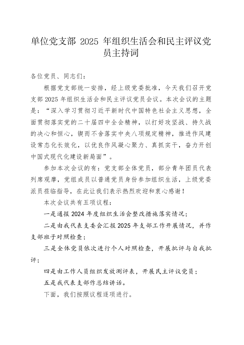 单位党支部2025年组织生活会和民主评议党员主持词各位党员、同志们:根据党支部统一安排,经上级党委批准,今天我们召开党支部2025年组织生活会和民主评议党员会议。本次会议的主题是:“深入学习贯彻习近平新时代中国特色社会主义思想,全面贯彻落实党的二十届四中全会精神,以打好攻坚战、持久战的决心和恒心,锲而不舍落实中央八项规定精神,推进作风建设常态化长效化,以优良作风凝心聚力、真抓实干,奋力开创中国式现代化建设新局面”。参加本次会议的有:党支部全体党员,部分青年团员代表列席观摩,党组成员以普通党员身份参加组织生活,上级党委派员莅临指导,在此让我们表示热烈欢迎和衷心感谢!本次会议共有五项议程:一是通报2024年度组织生活会整改措施落实情况:二是由我代表支委会汇报2025年支部工作开展情况,并作支部班子对照检查;三是全体党员依次进行个人对照检查,开展批评与自我批四是由工作人员组织发放测评表,开展民主评议党员:五是我代表支部作总结讲话。下面,我们按照议程逐项进行。