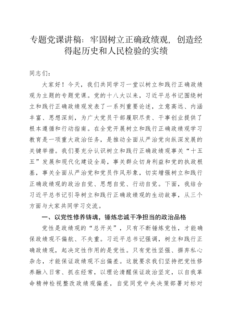 专题党课讲稿:牢固树立正确政绩观,创造经得起历史和人民检验的实绩同志们:大家好!今天,我们共同学习一堂以树立和践行正确政绩观为主题的专题党课。党的十八大以来,习近平总书记围绕树立和践行正确政绩观发表了一系列重要论述,立意高远、内涵丰富、思想深刻,为广大党员干部履职尽责、干事创业提供了根本遵循和行动指南。在全党开展树立和践行正确政绩观学习教育是一项重大政治任务,是推动全面从严治党向纵深发展的关键举措。我们要充分认识树立和践行正确政绩观事关“十五五”发展和现代化建设全局,事关群众切身利益和党的执政根基,事关全面从严治党和党员作风形象,切实增强树立和践行正确政绩观的政治自觉、思想自觉、行动自觉。下面,我结合习近平总书记引导树立和践行正确政绩观的生动故事,从三个方面与大家共同学习交流。一、以党性修养铸魂,锤炼忠诚干净担当的政治品格党性是政绩观的“总开关”,只有不断锤炼党性,才能确保政绩观不偏航、不失重。习近平总书记强调,树立和践行正确政绩观,起决定性作用的是党性。只有党性坚强、摒弃私心杂念,才能保证政绩观不出偏差。这就要求我们坚持把党性修养融入日常、抓在经常,以理论清醒保证政治坚定,以自我革命精神检视整改政绩观偏差,自觉同党中央决策部署对标对