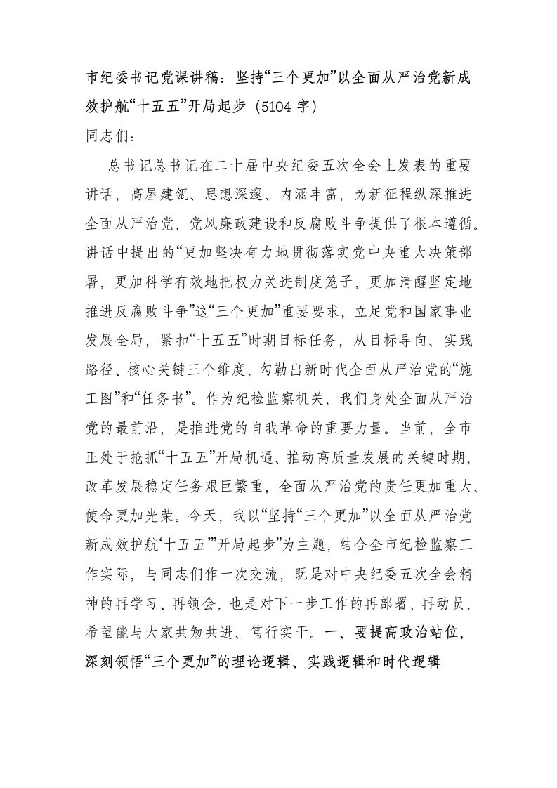 市纪委书记党课讲稿:坚持“三个更加”以全面从严治党新成效护航“十五五”开局起步(5104字)同志们:总书记总书记在二十届中央纪委五次全会上发表的重要讲话,高屋建瓴、思想深邃、内涵丰富,为新征程纵深推进全面从严治党、党风廉政建设和反腐败斗争提供了根本遵循。讲话中提出的“更加坚决有力地贯彻落实党中央重大决策部署,更加科学有效地把权力关进制度笼子,更加清醒坚定地推进反腐败斗争”这“三个更加”重要要求,立足党和国家事业发展全局,紧扣“十五五”时期目标任务,从目标导向、实践路径、核心关键三个维度,勾勒出新时代全面从严治党的“施工图”和“任务书”。作为纪检监察机关,我们身处全面从严治党的最前沿,是推进党的自我革命的重要力量。当前,全市正处于抢抓“十五五”开局机遇、推动高质量发展的关键时期,改革发展稳定任务艰巨繁重,全面从严治党的责任更加重大、使命更加光荣。今天,我以“坚持“三个更加”以全面从严治党新成效护航‘十五五”开局起步”为主题,结合全市纪检监察工作实际,与同志们作一次交流,既是对中央纪委五次全会精神的再学习、再领会,也是对下一步工作的再部署、再动员,希望能与大家共勉共进、笃行实干。一、要提高政治站位,深刻领悟“三个更加”的理论逻辑、实践逻辑和时代逻辑